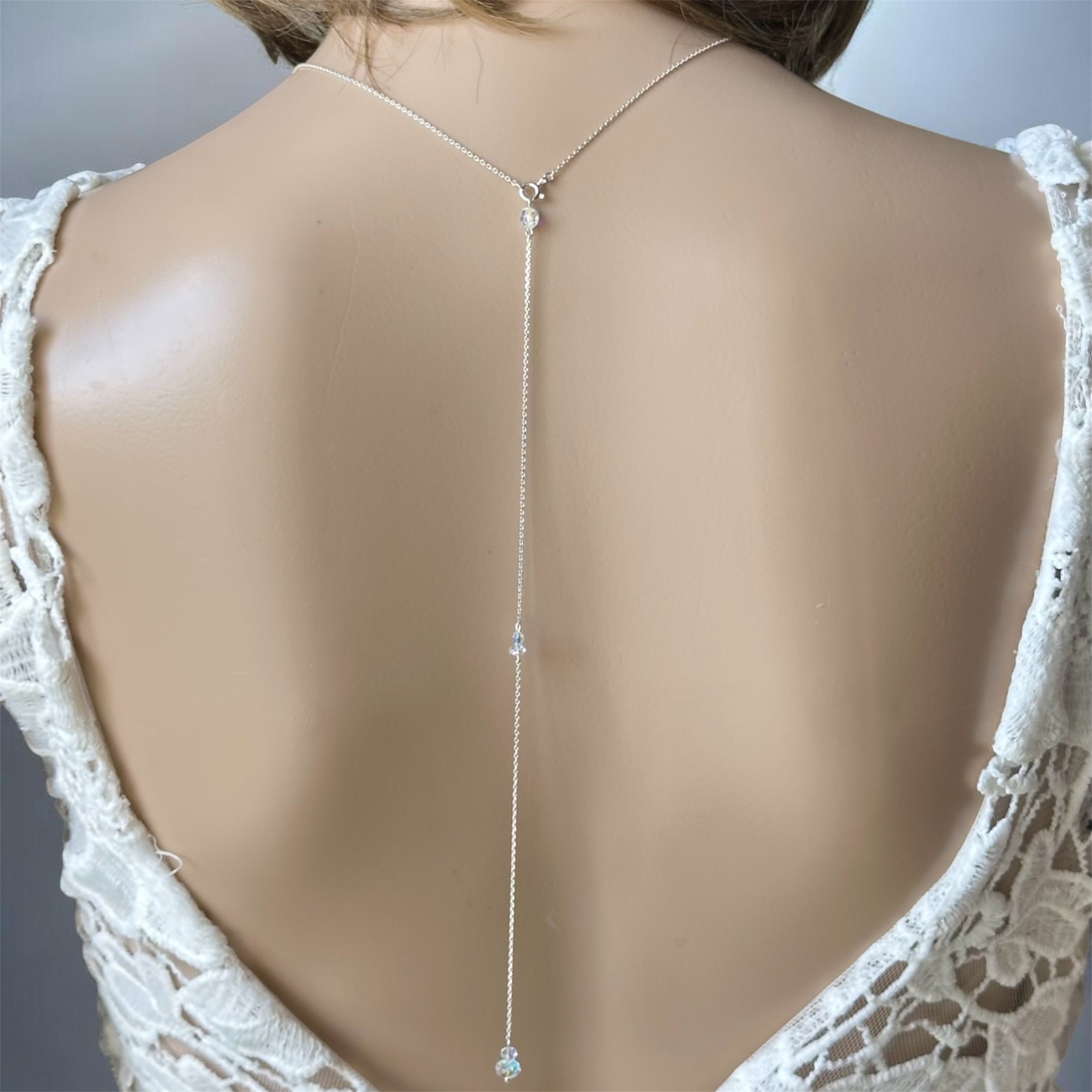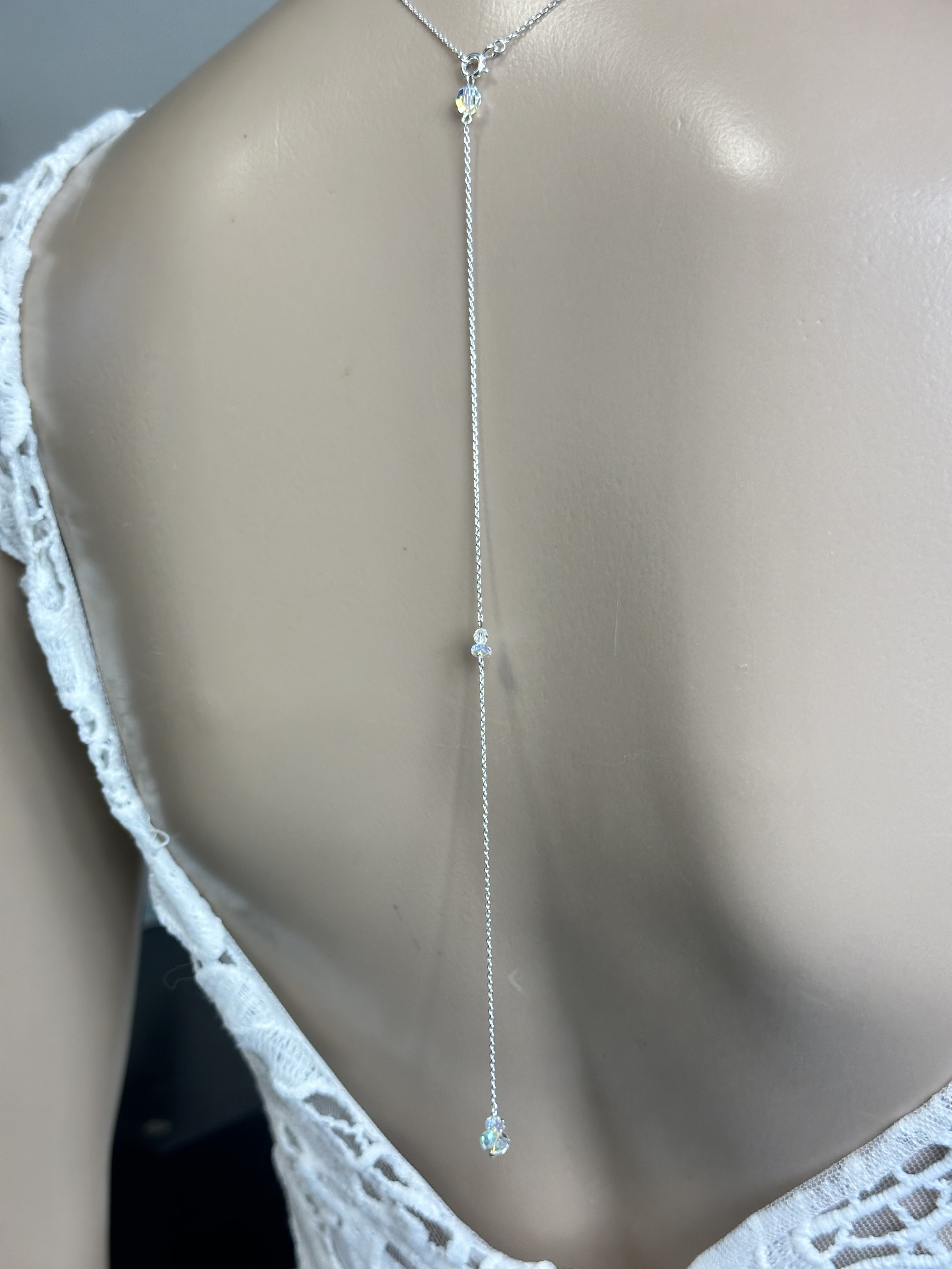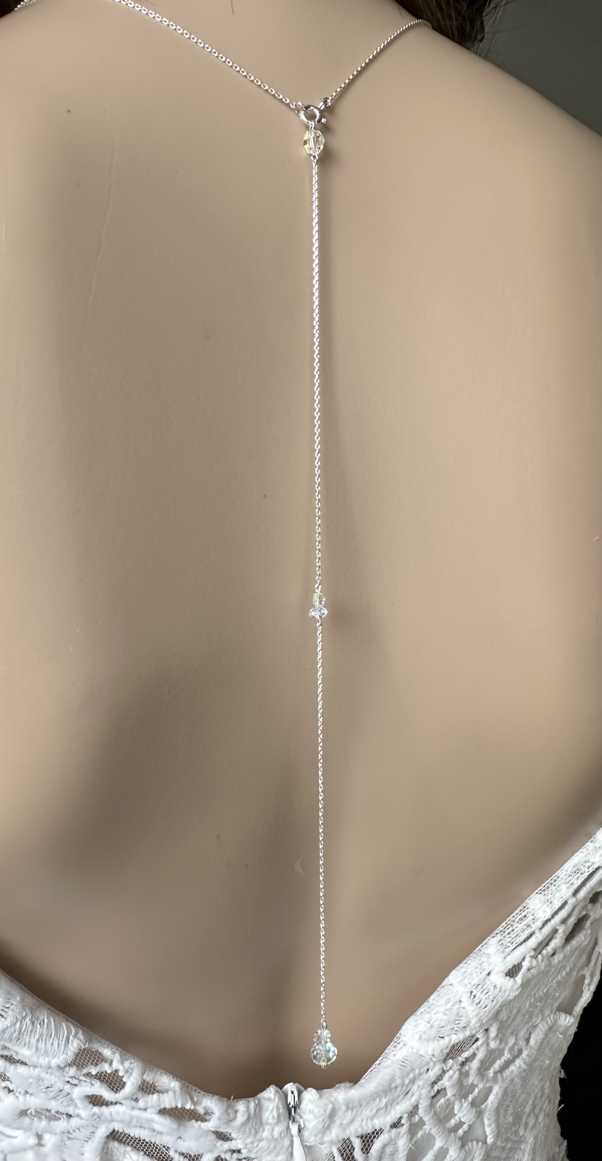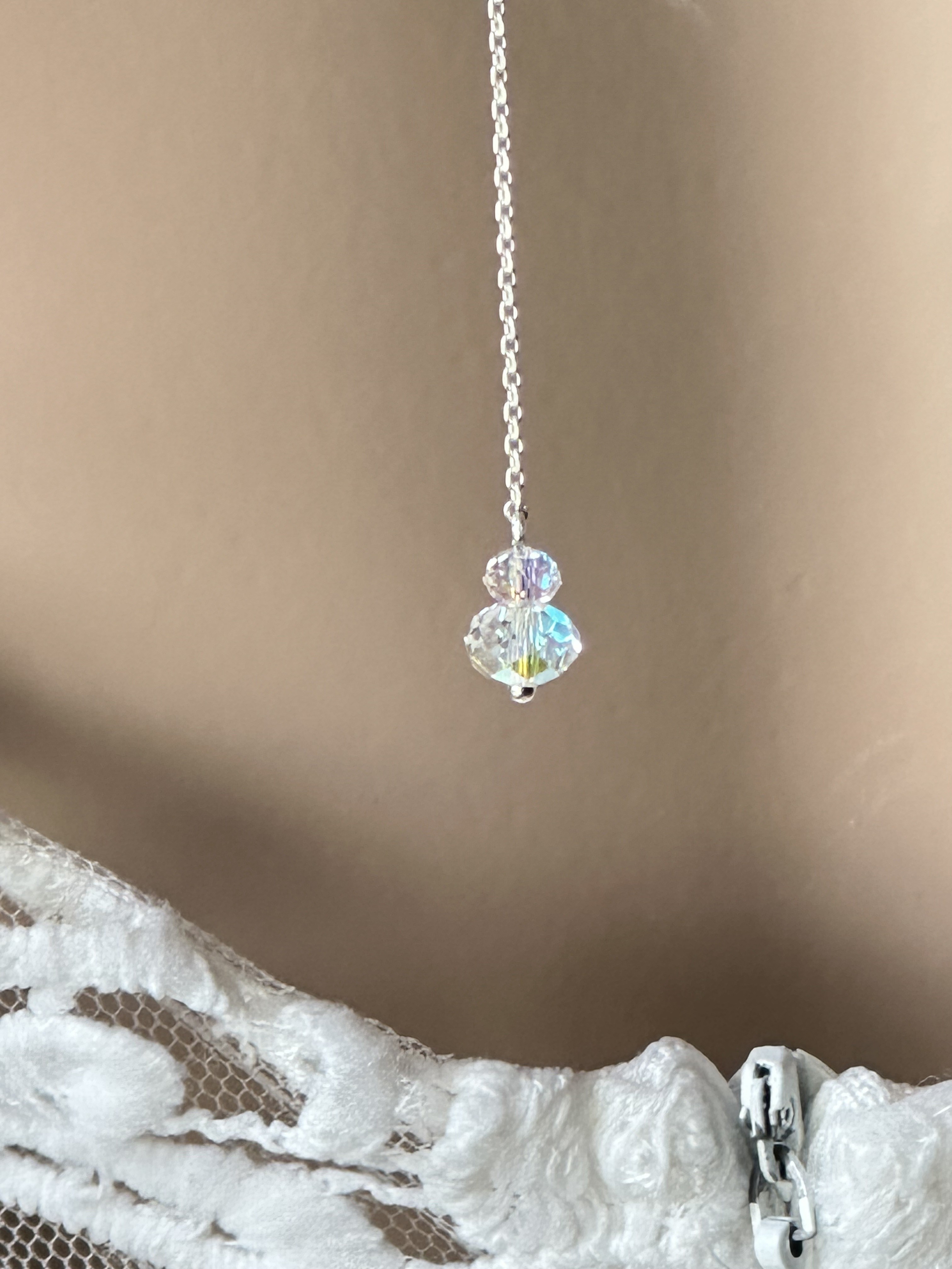 Le collier et son bijou de dos amovible ont été réalisés avec une chaîne fine en argent 925 et des perles en cristal à reflets de 3, 4, 5 et 6mm.