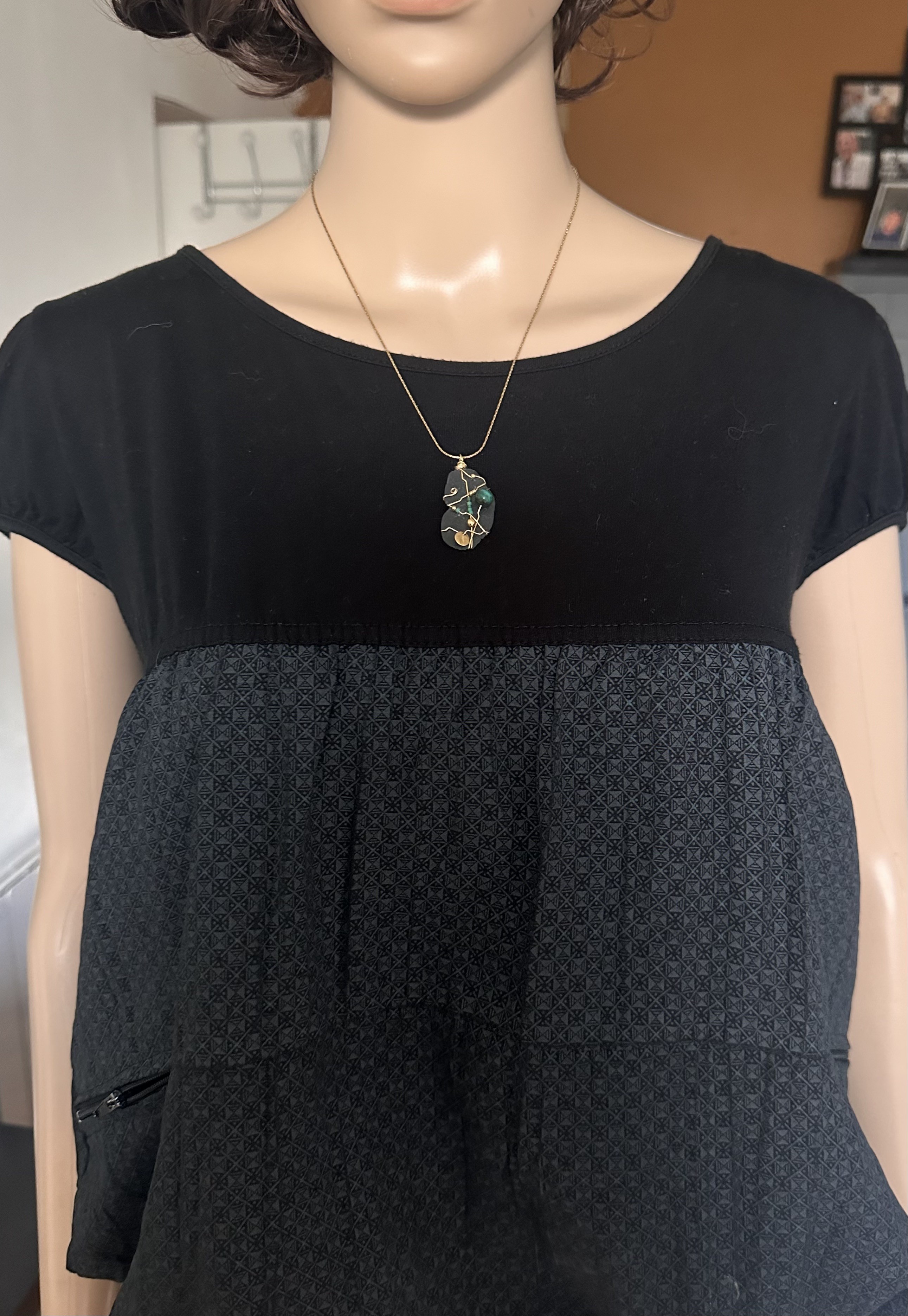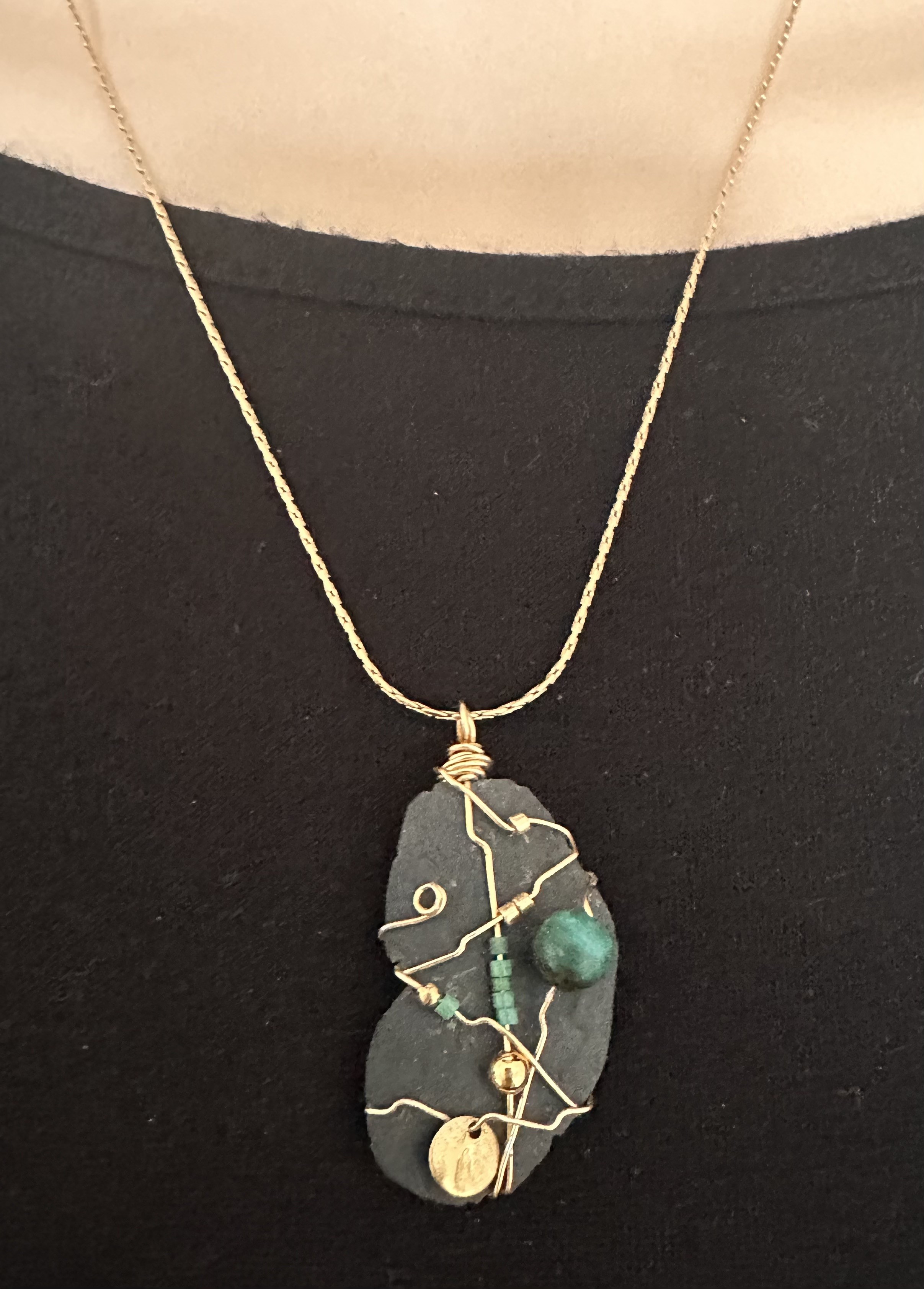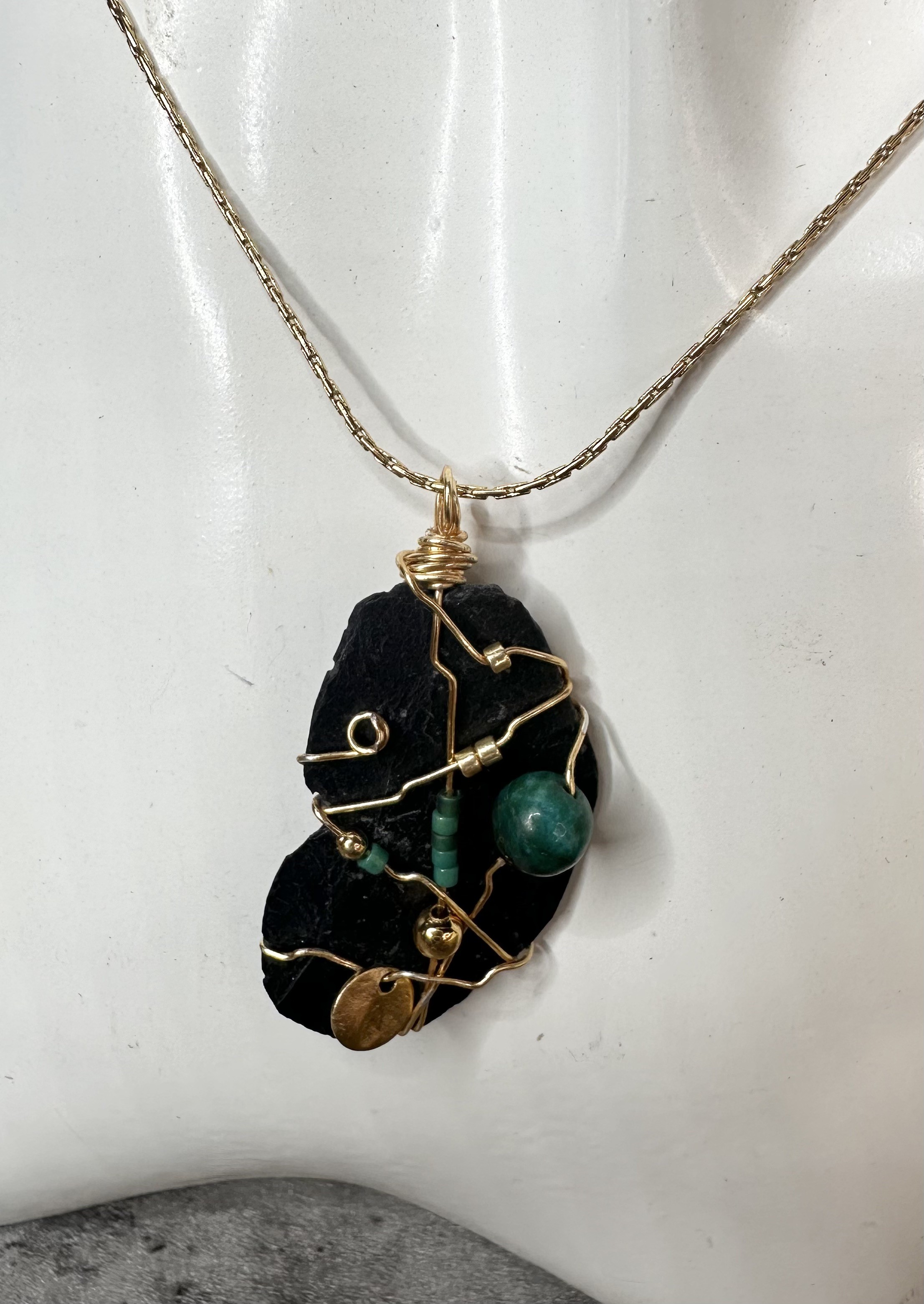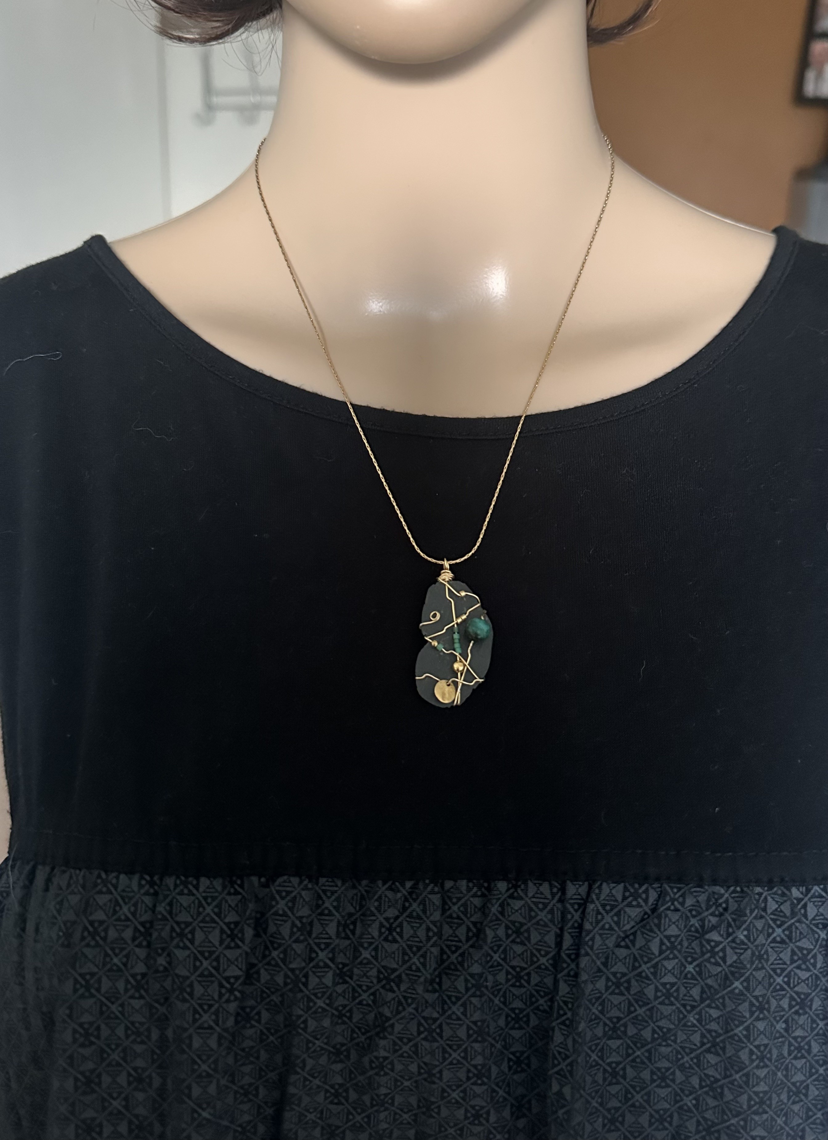 Le pendentif en ardoise est enveloppé de fils en métal doré avec une perle en chrysocolle africaine naturelle et des petites perles dorées. Il mesure environ 4cm au plus long x 2cm au plus large(attache comprise)