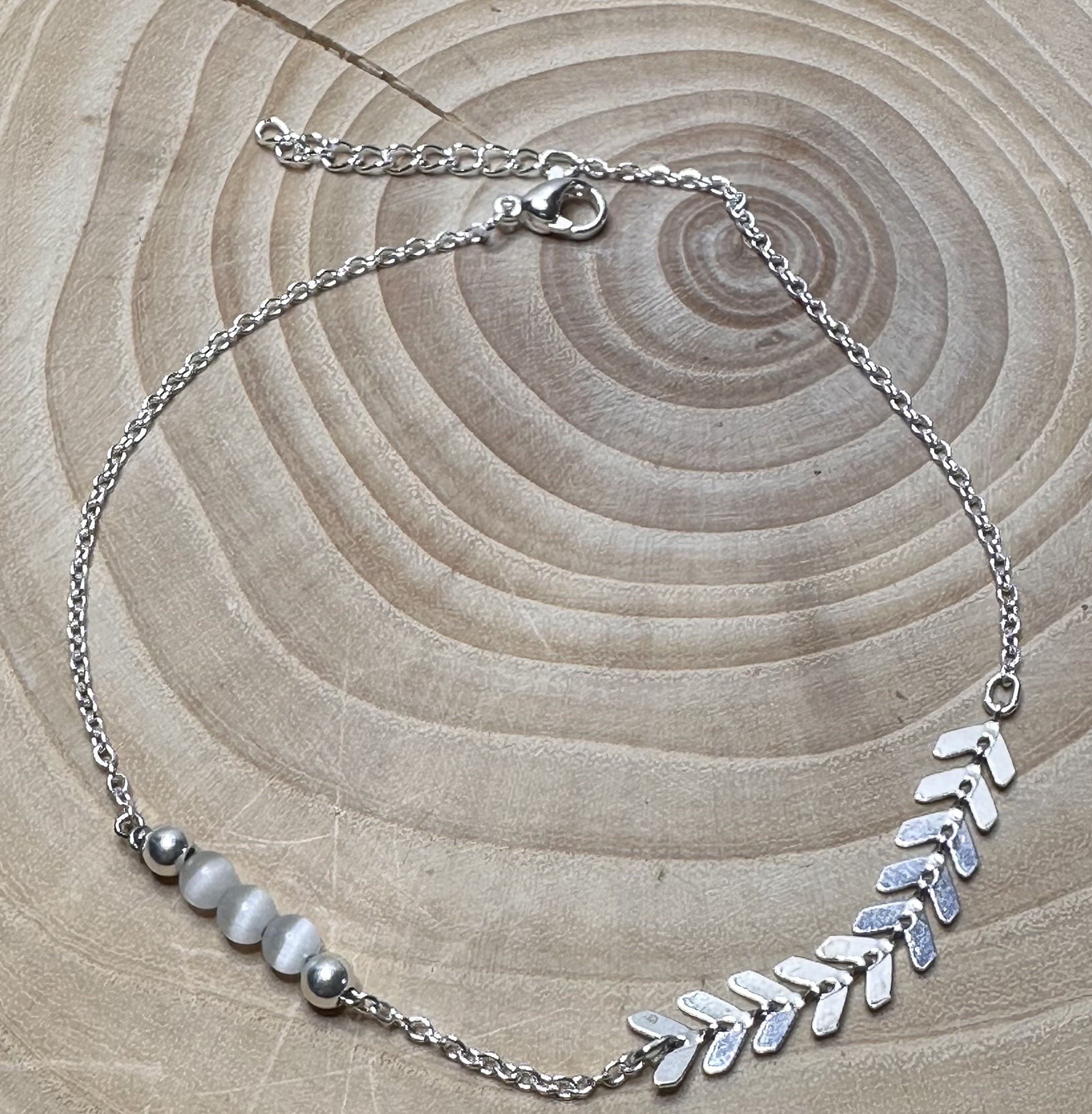 Cette chaine de cheville est réalisée avec une chaîne en acier inoxydable couleur argent ,une chaine épis argenté , 3 petites pierres de lune blanche et 2 perles en argent 925.