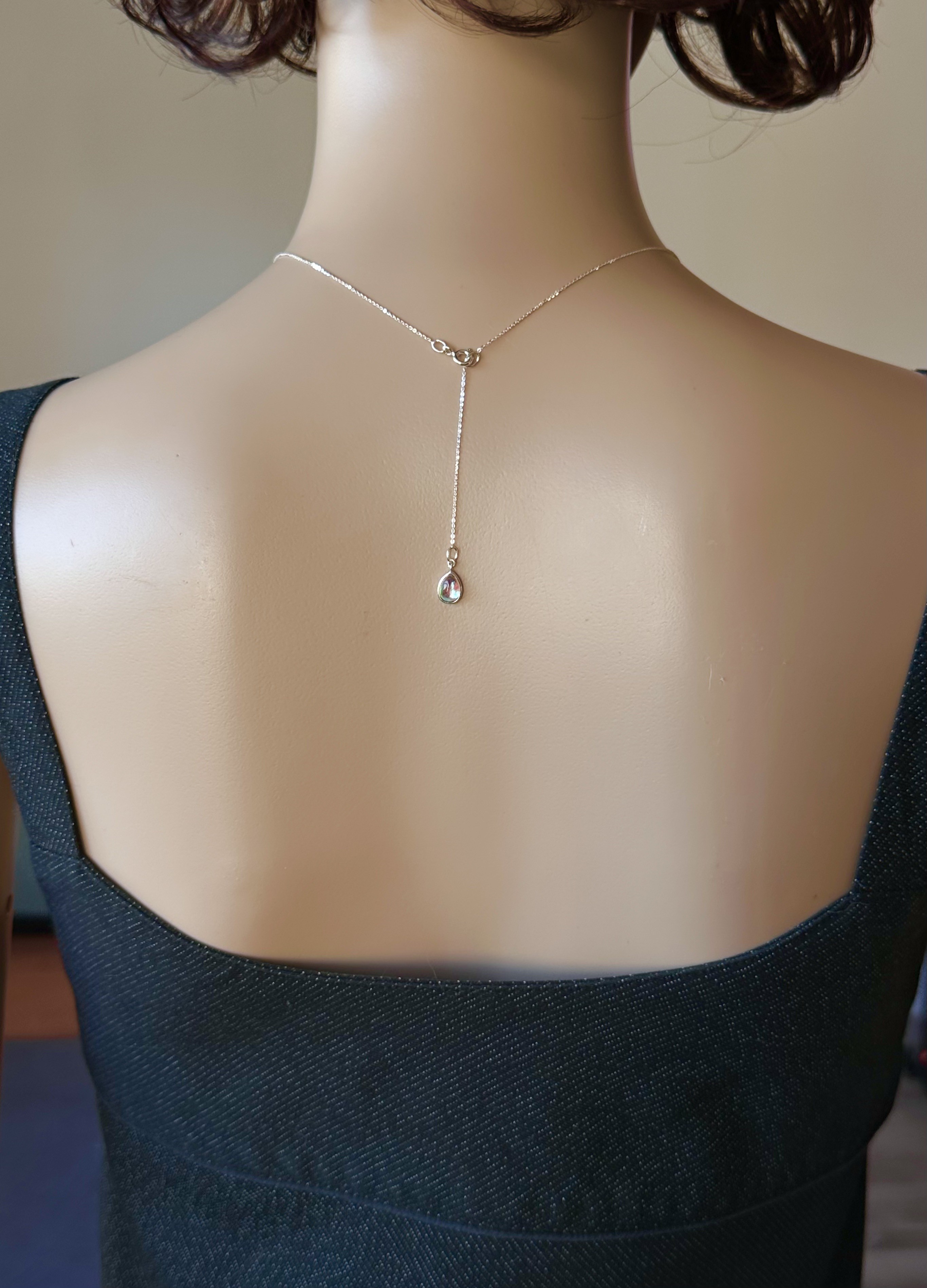 J'ai réalisé ce collier, avec son bijou de dos court, non amovible, avec une chaîne très fine et brillante en argent 925 et des gouttes en pierre de lune synthétique, sur un support en argent .