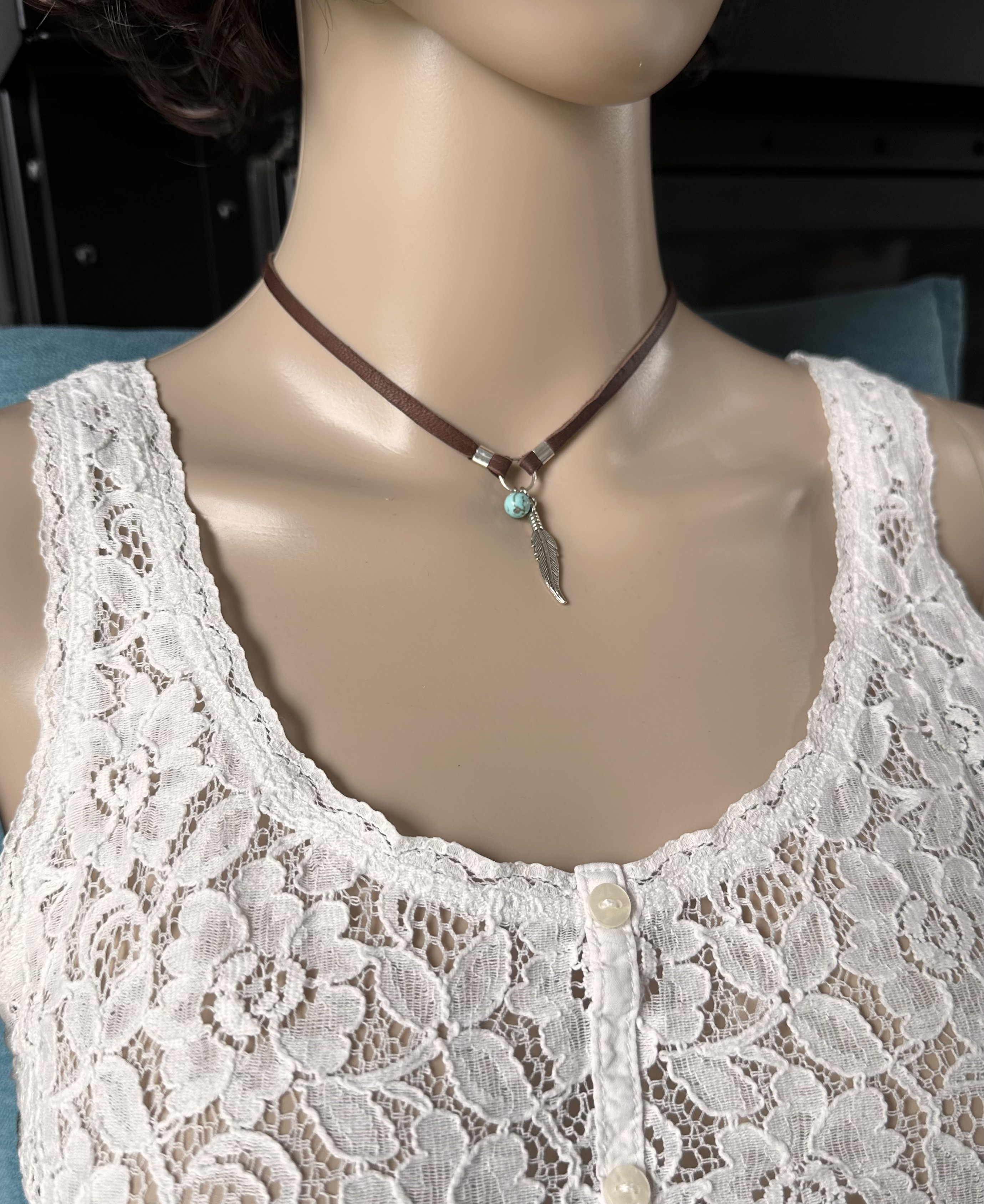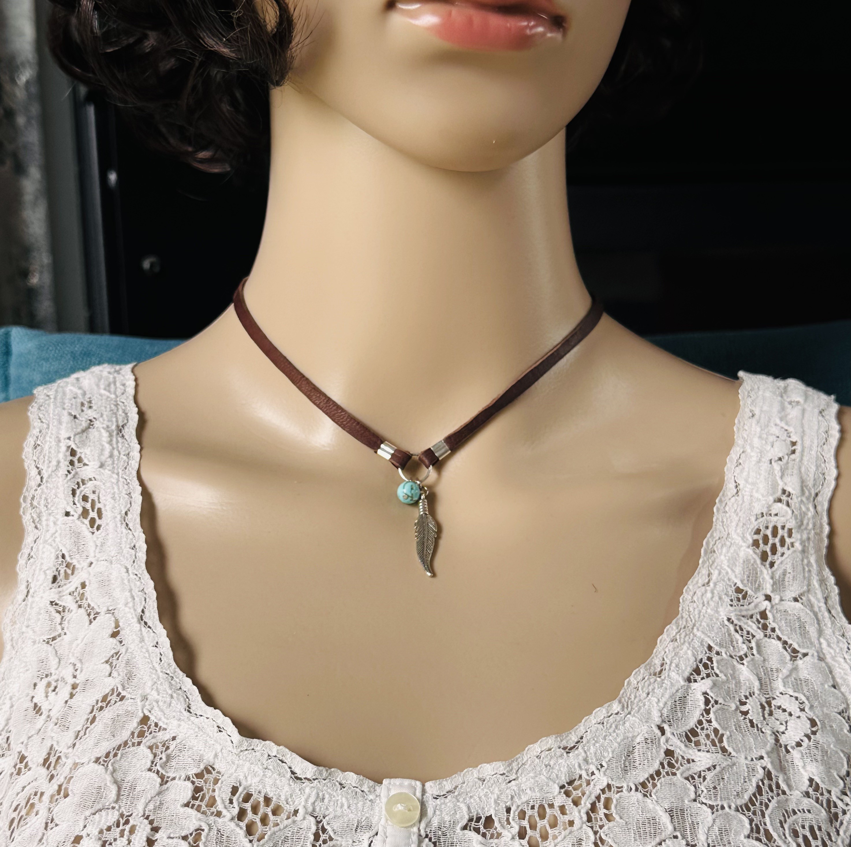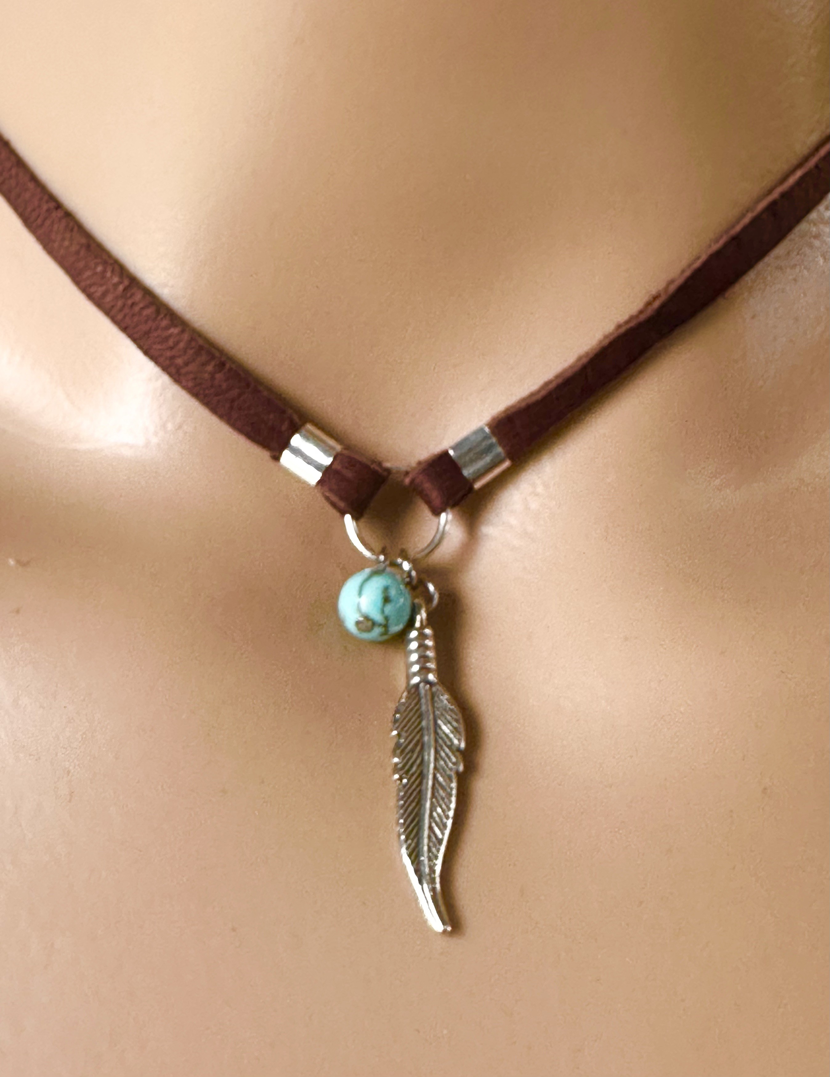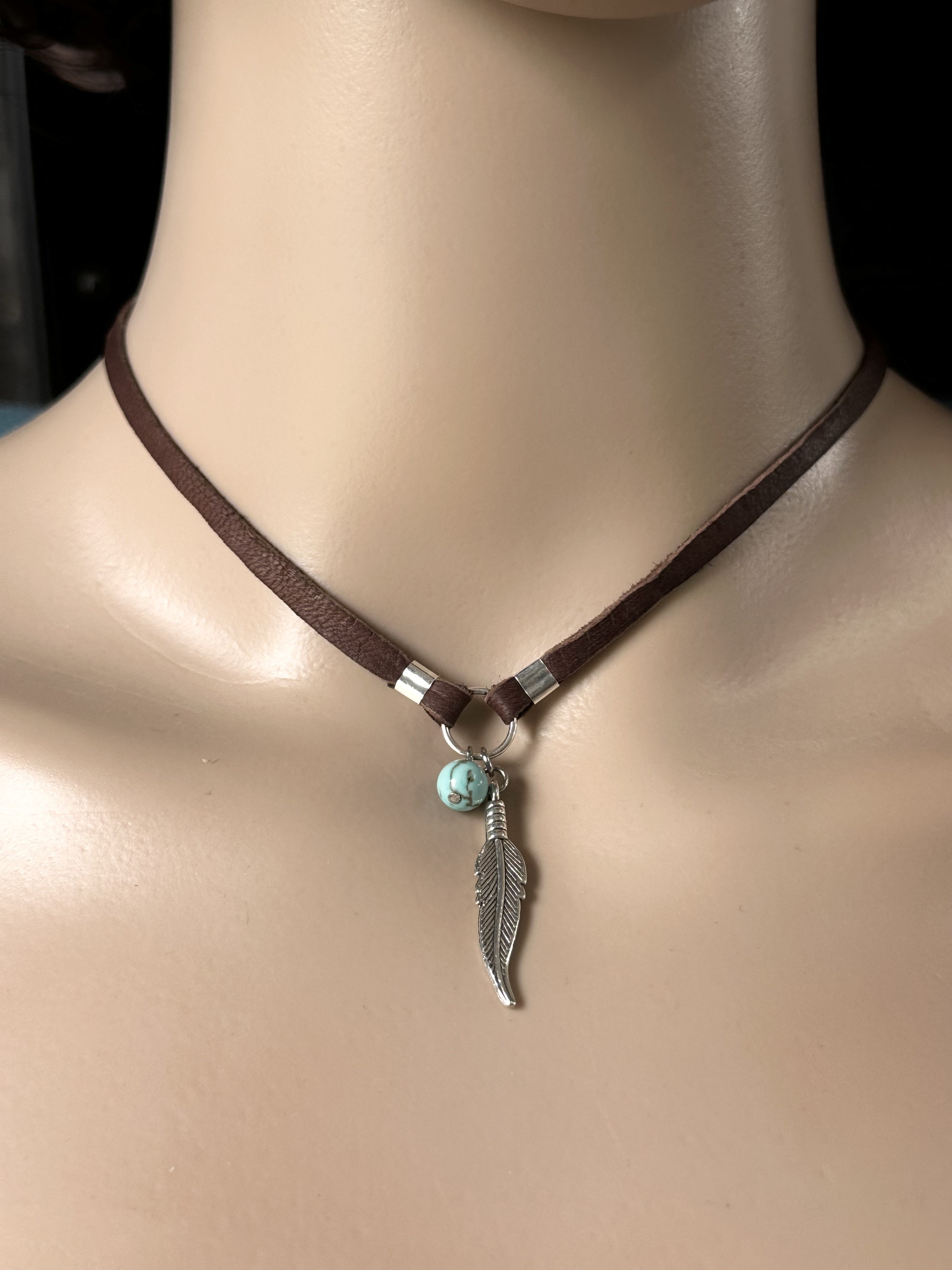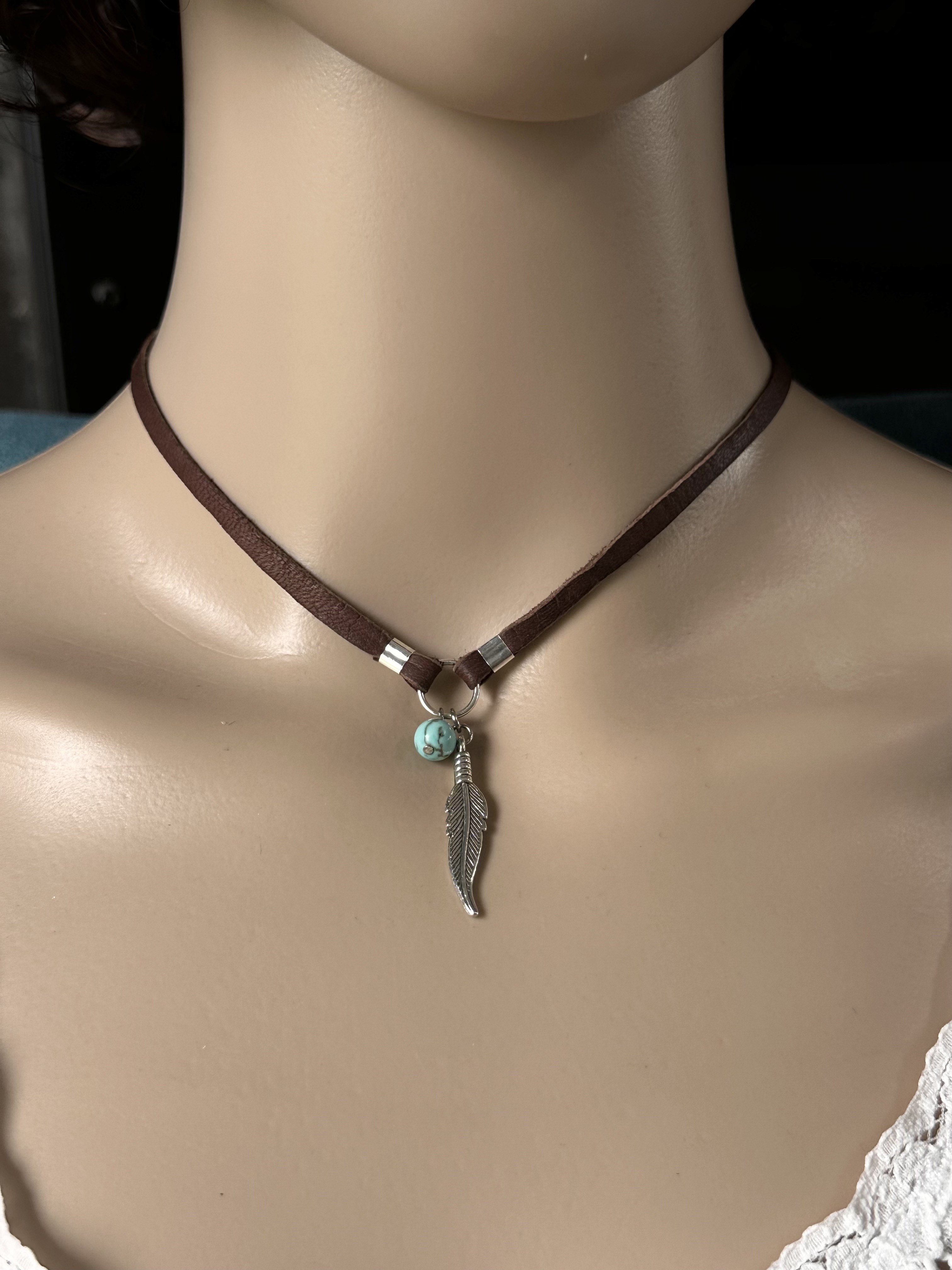Collier court réalisé avec un lacet en cuir de daim brun, de 5mm, ultra souple et un pendentif composé de d'une plume en métal et d'une perle en turquoise naturelle de 6mm.
