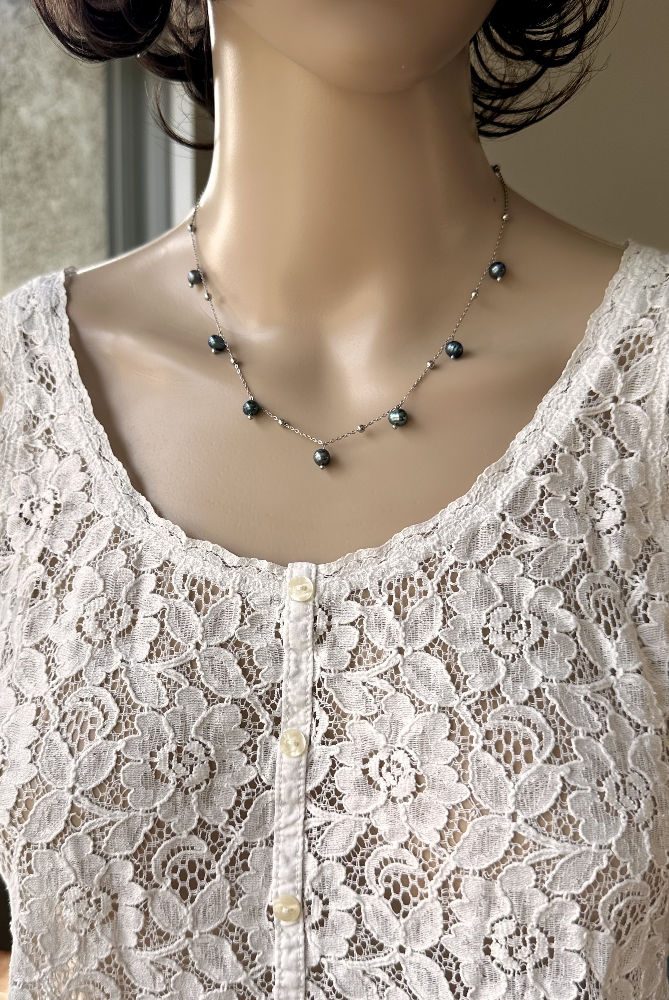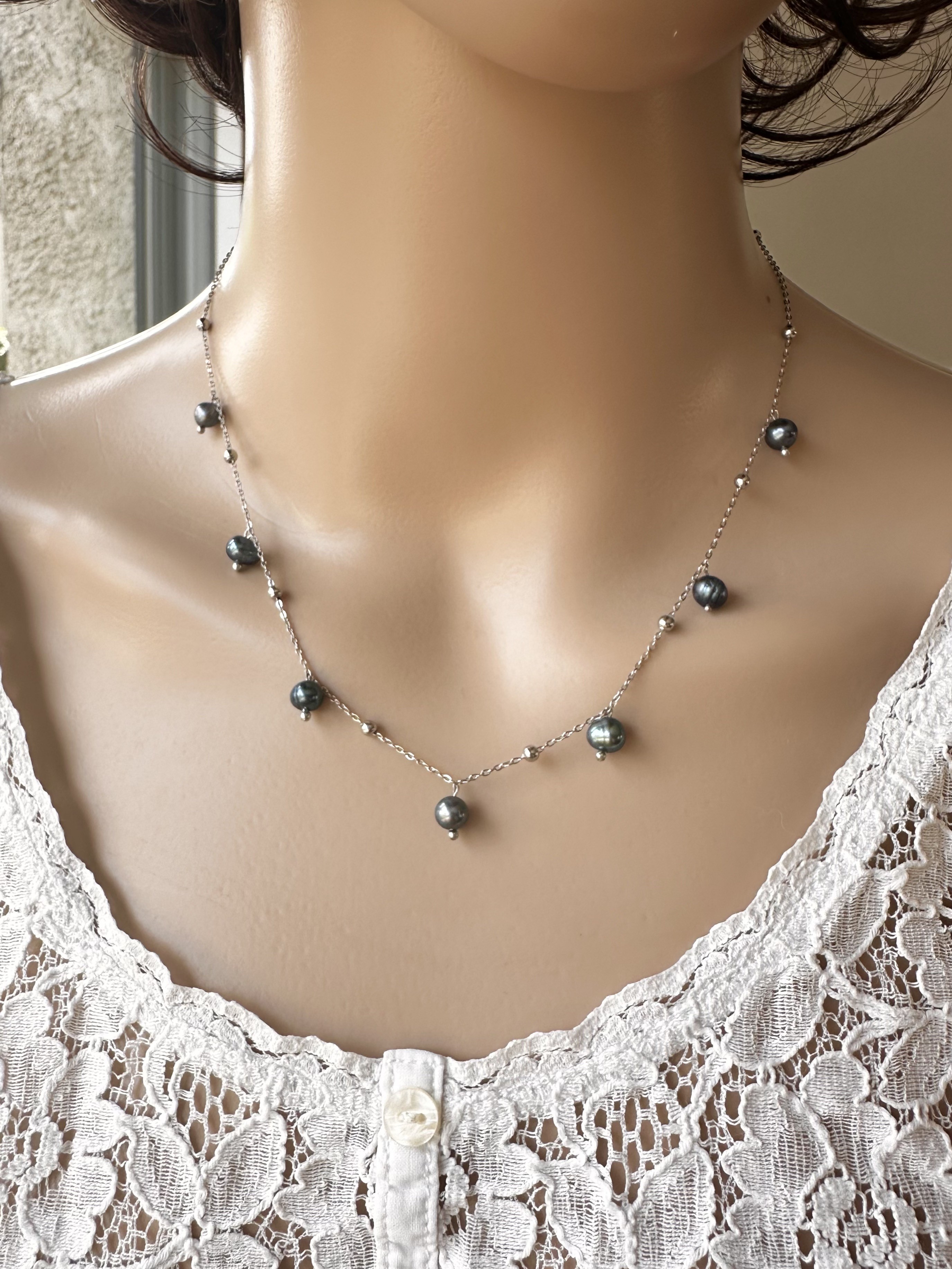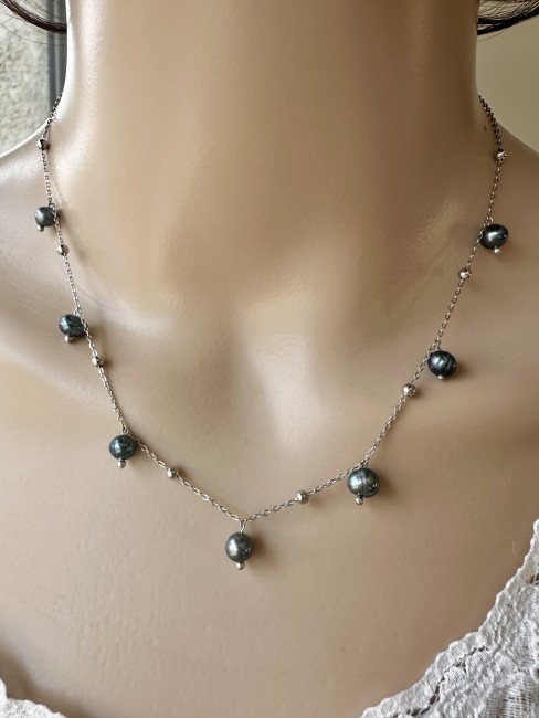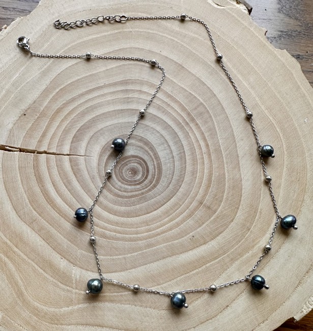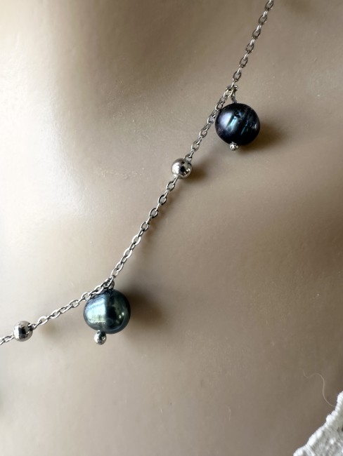 Ce collier est réalisé avec une chaine en acier inoxydable fantaisie et des perles de culture d'eau douce teintées.