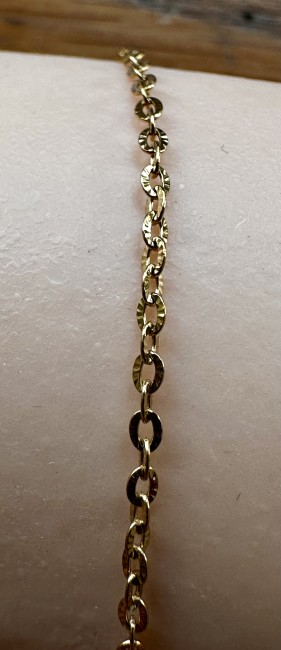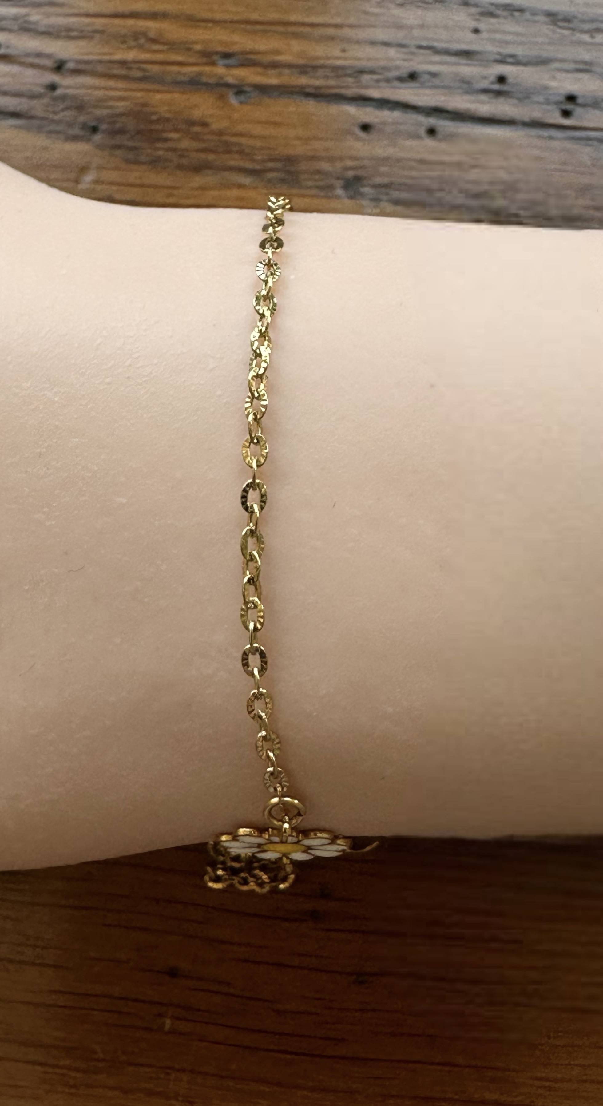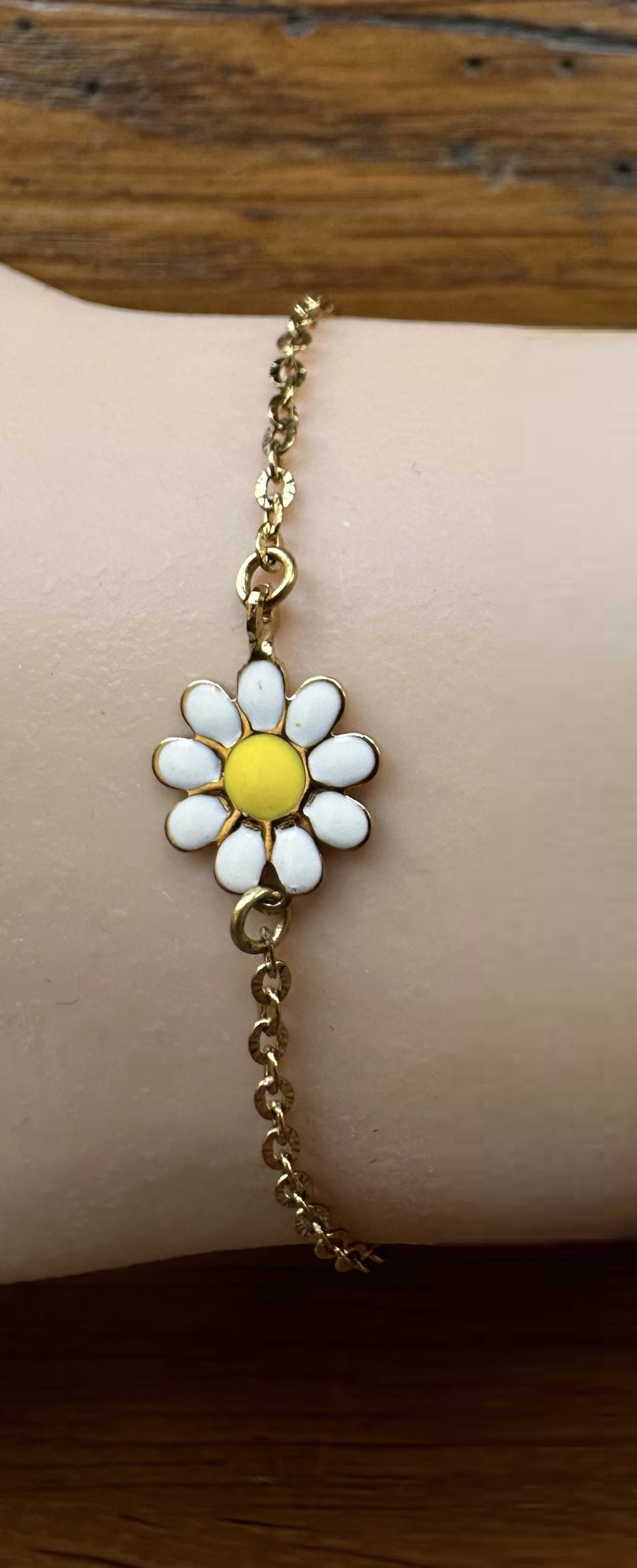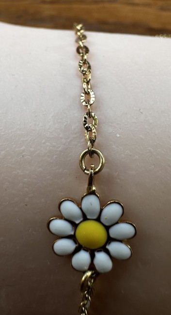 Ce bracelet est réalisé avec une chaîne en acier inoxydable, maille soleil, une petite marguerite en résine époxy de 10mm.