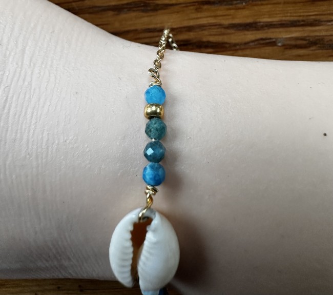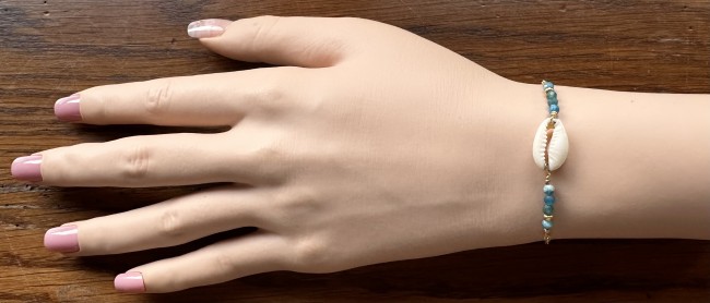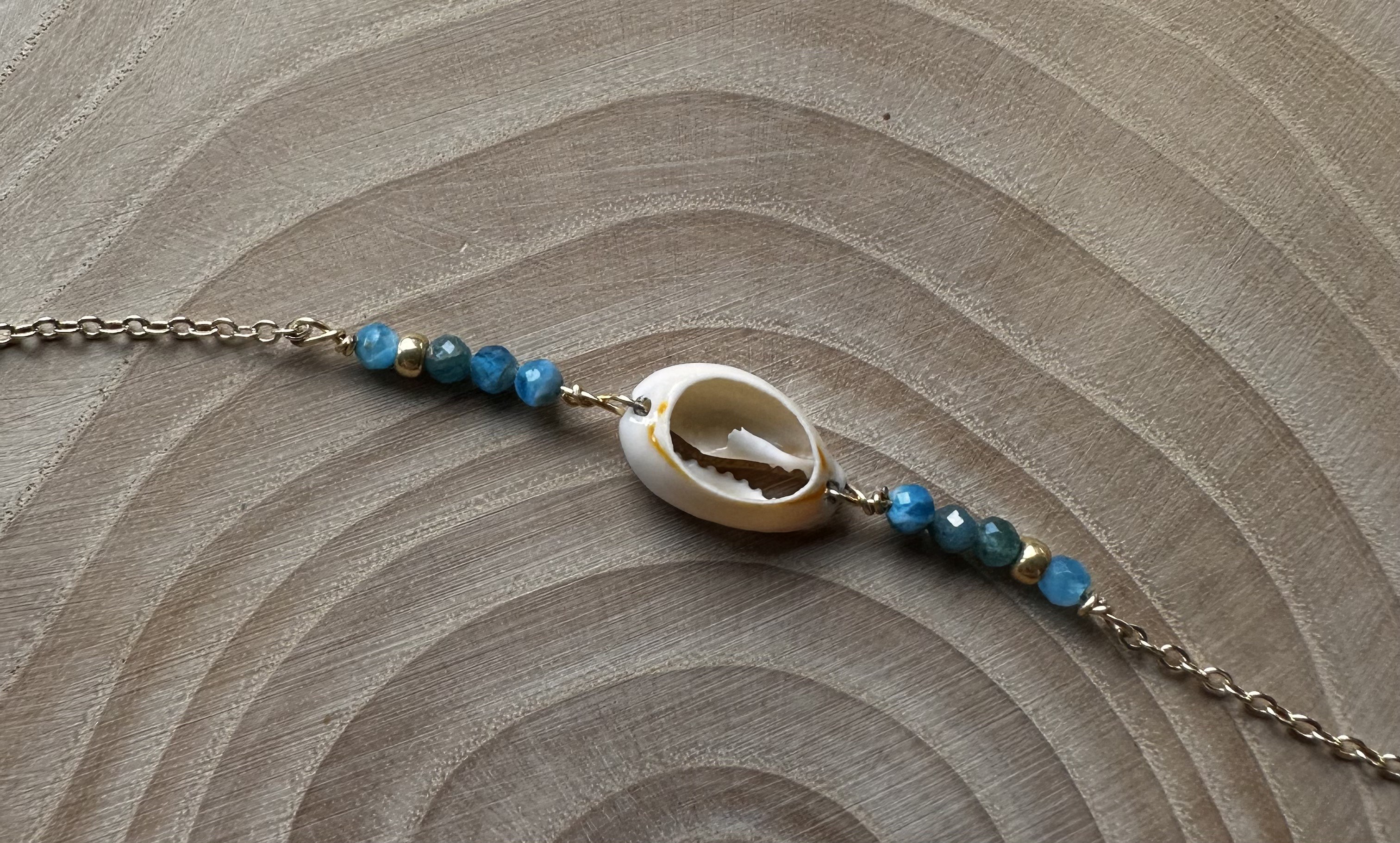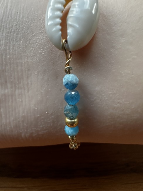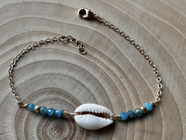Ce bracelet est réalisé avec une chaîne en acier inoxydable plaqué or, un coquillage Cauris, des perles naturelles facettées en apatite de 3mm et 2 perles dorées.