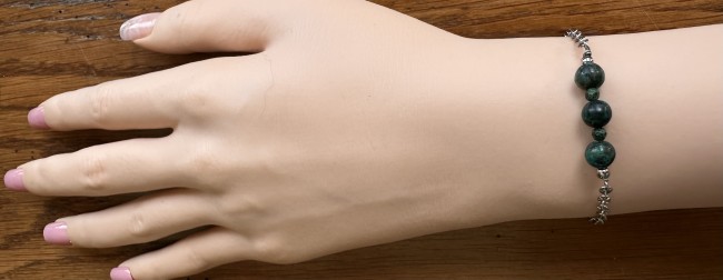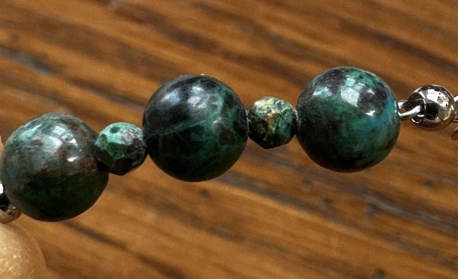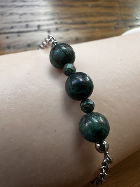 Ce bracelet est réalisé avec une chaîne fantaisie en acier inoxydable et des perles en chrysocolle africaine de 3 et 6mm.