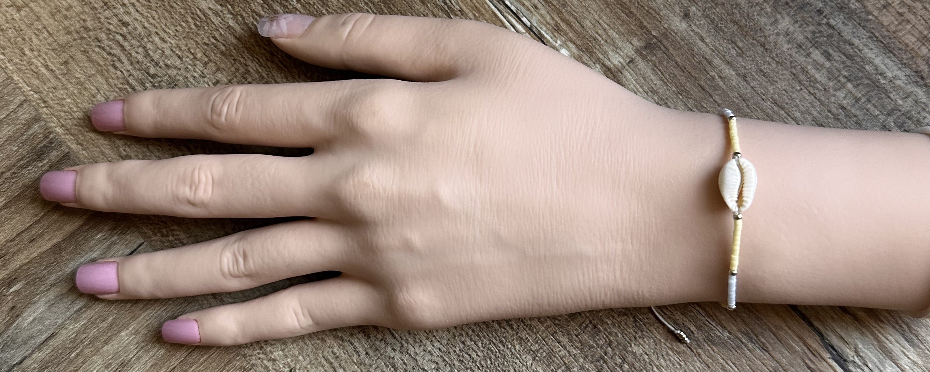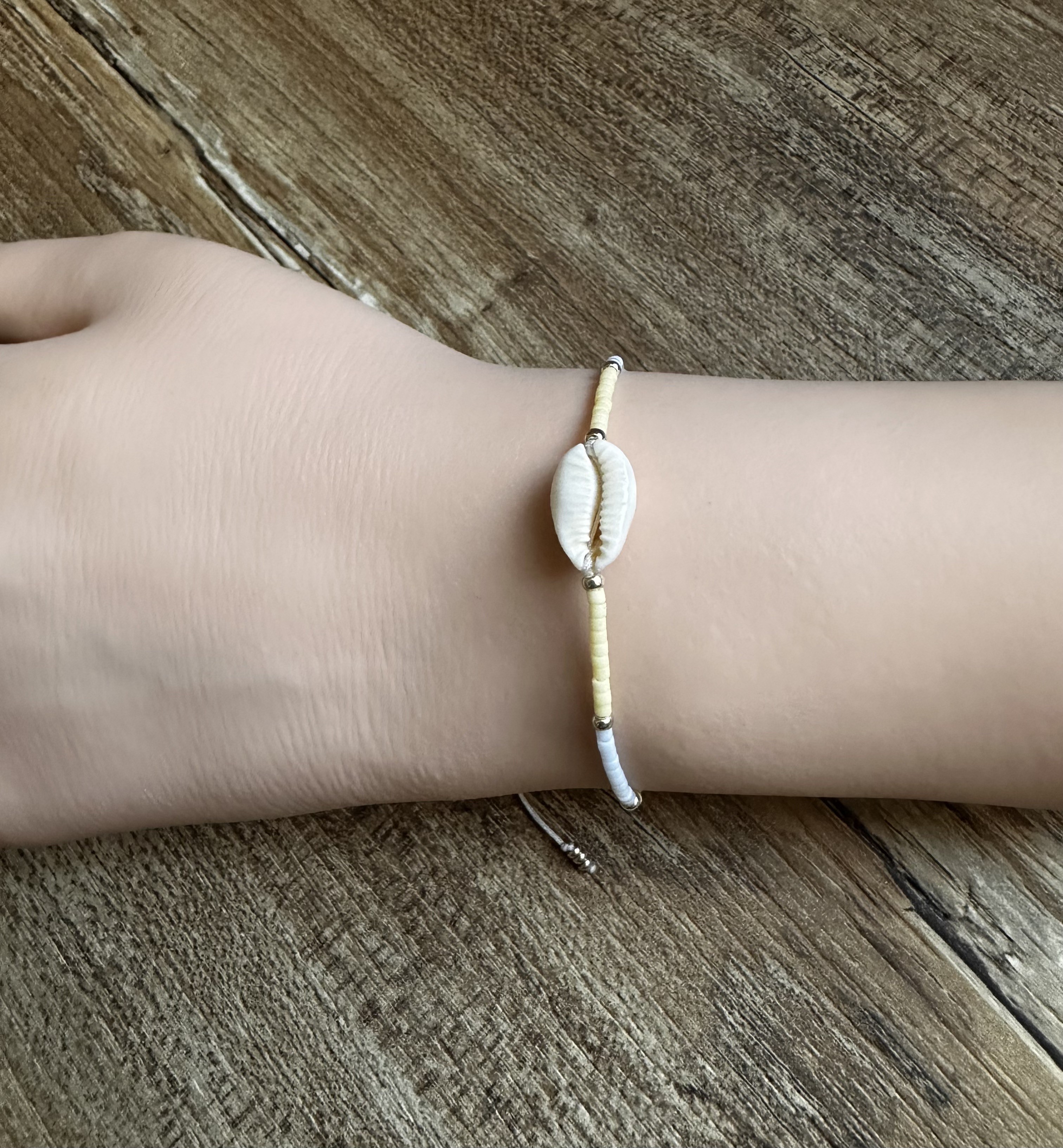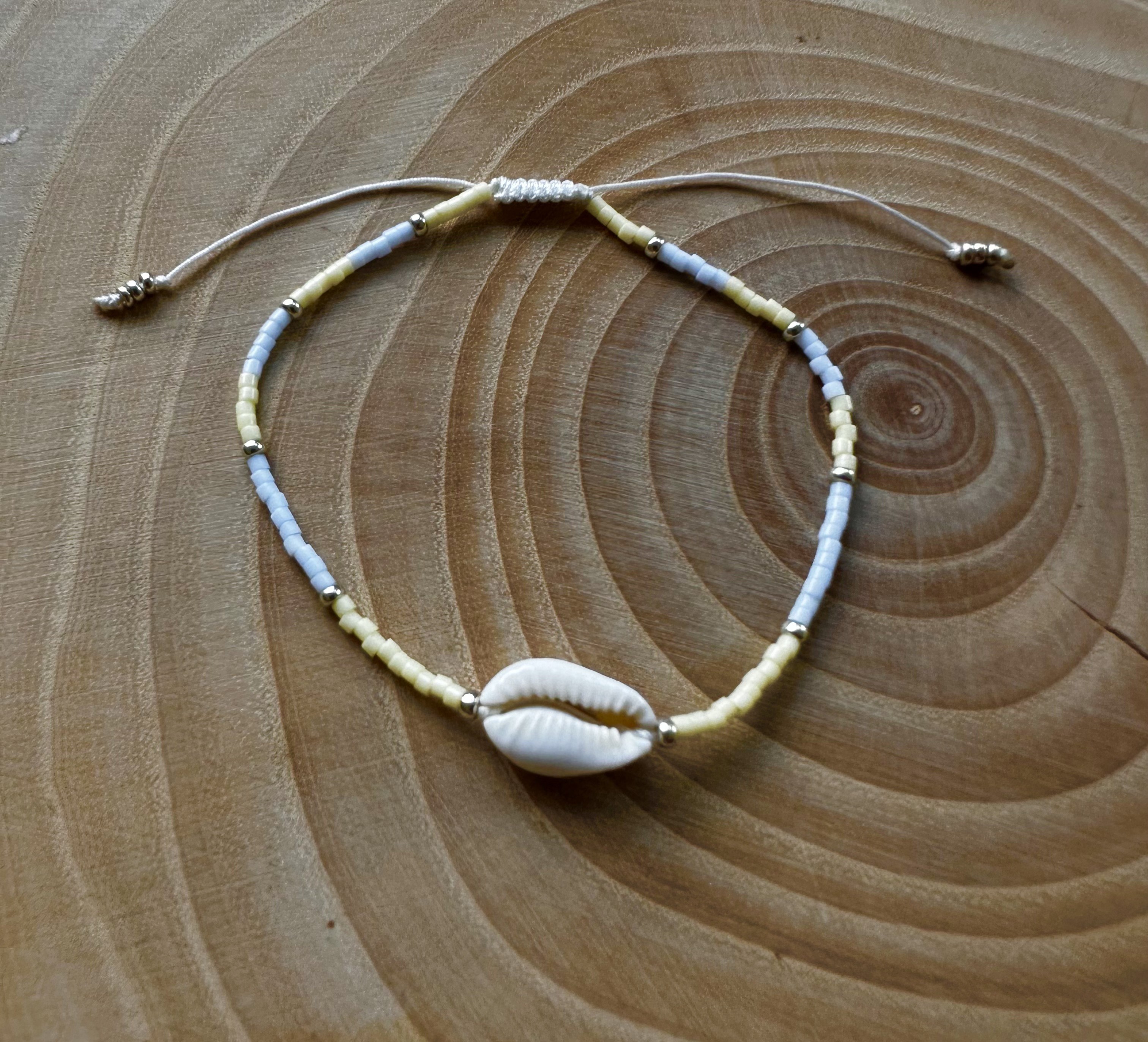 et des perles en verre en verre Miyuki jaunes pastels, bleues pâles et argentées . Il est réglable: de 16 à 24cm environ, grâce au noeud en macramé coulissant. (il faut pouvoir y passer la main pour l’enfiler )