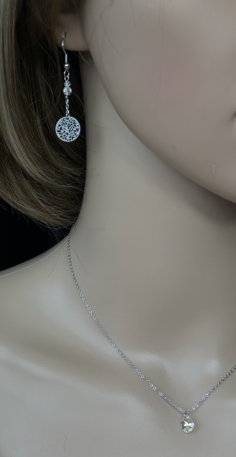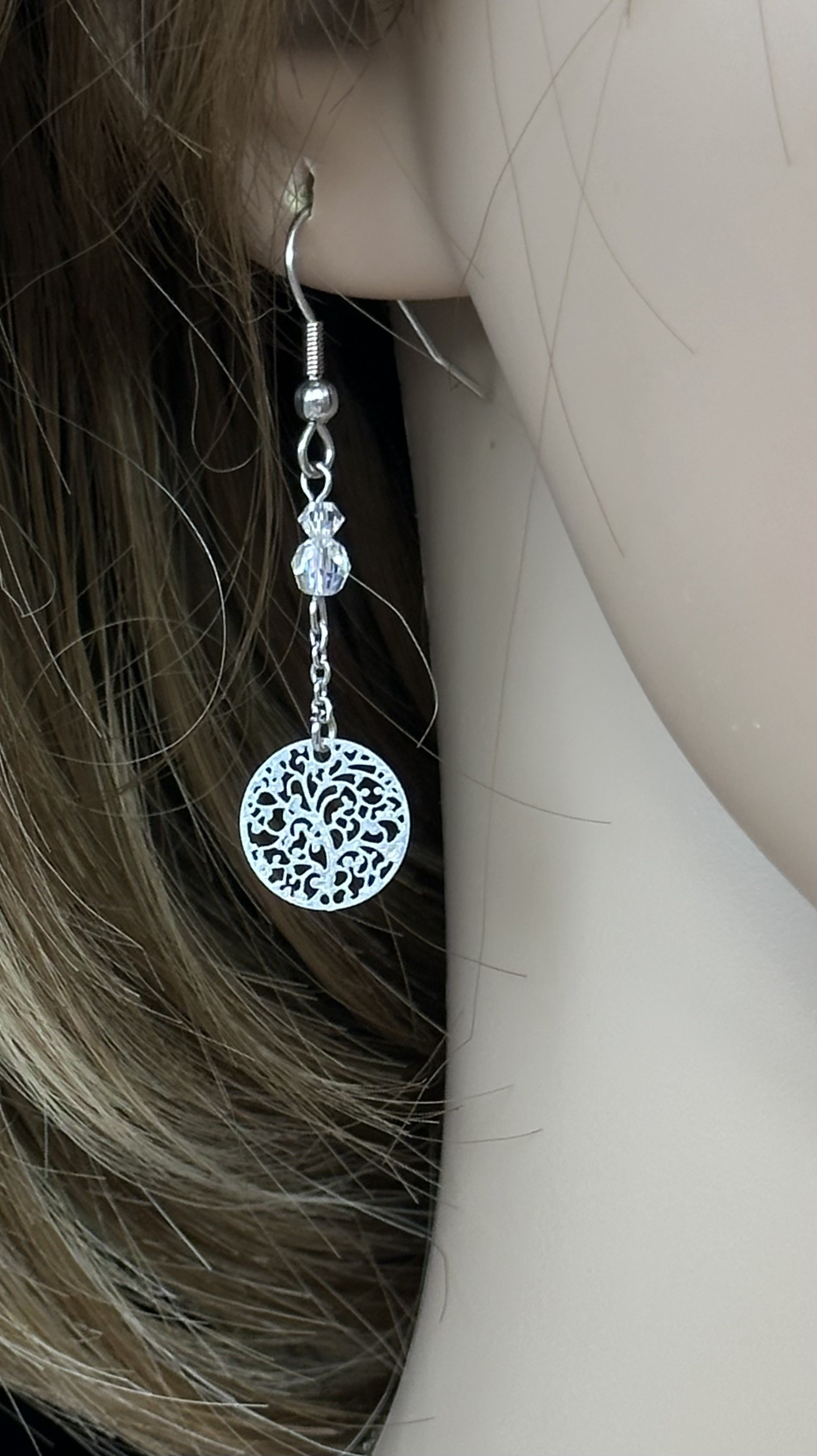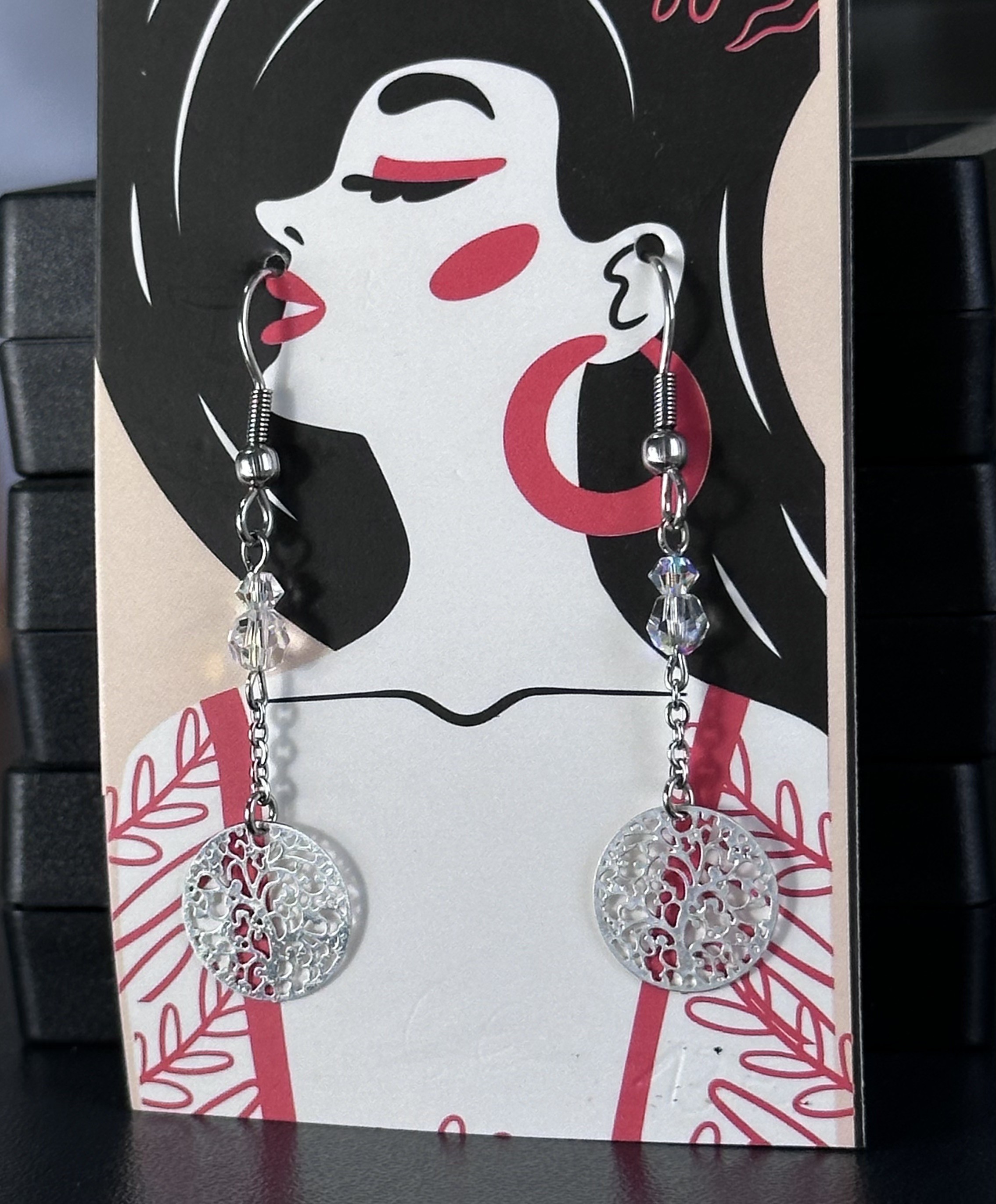 Boucles d'oreilles réalisées avec des crochets en acier inoxydable, des perles en cristal et une petite estampe arbre de vie en métal argenté.