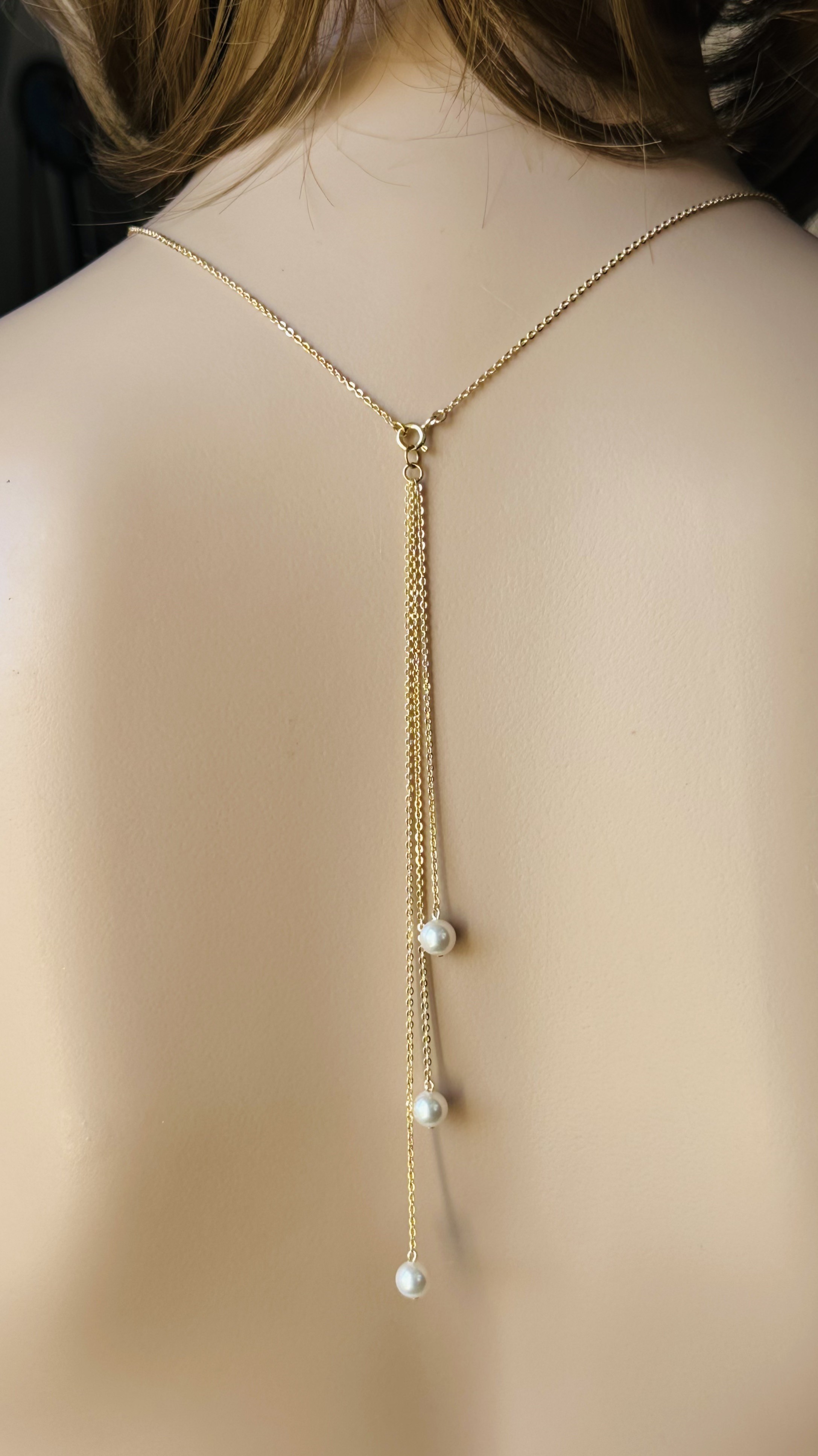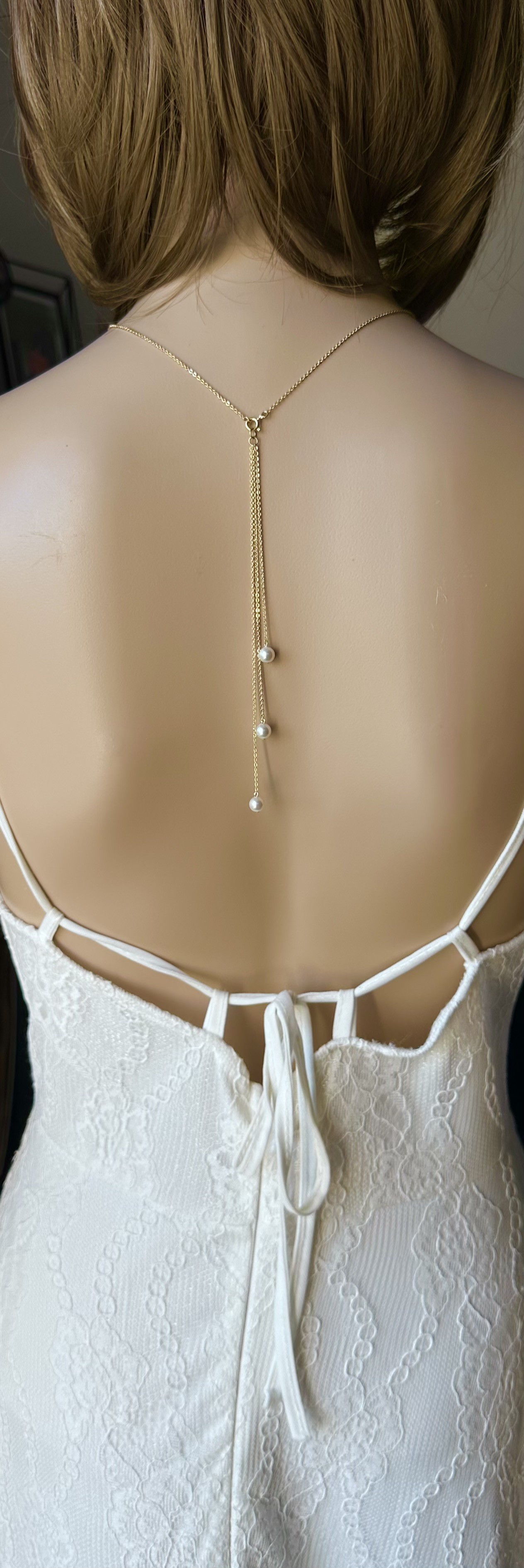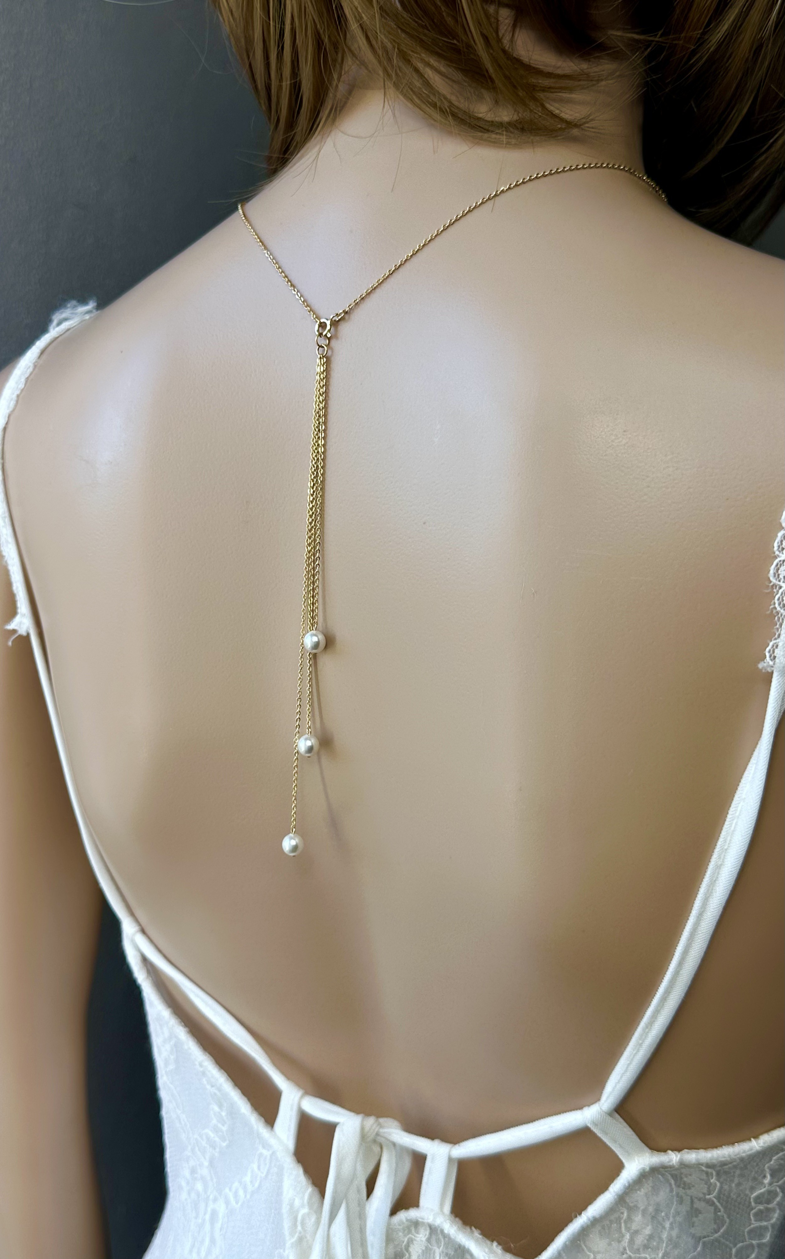Le collier, d'environ 42,5cm, dispose d'un fermoir, où l’on accroche le bijou de dos composé de 3 chaînes de tailles différentes.Il mesure 14cm au plus long.