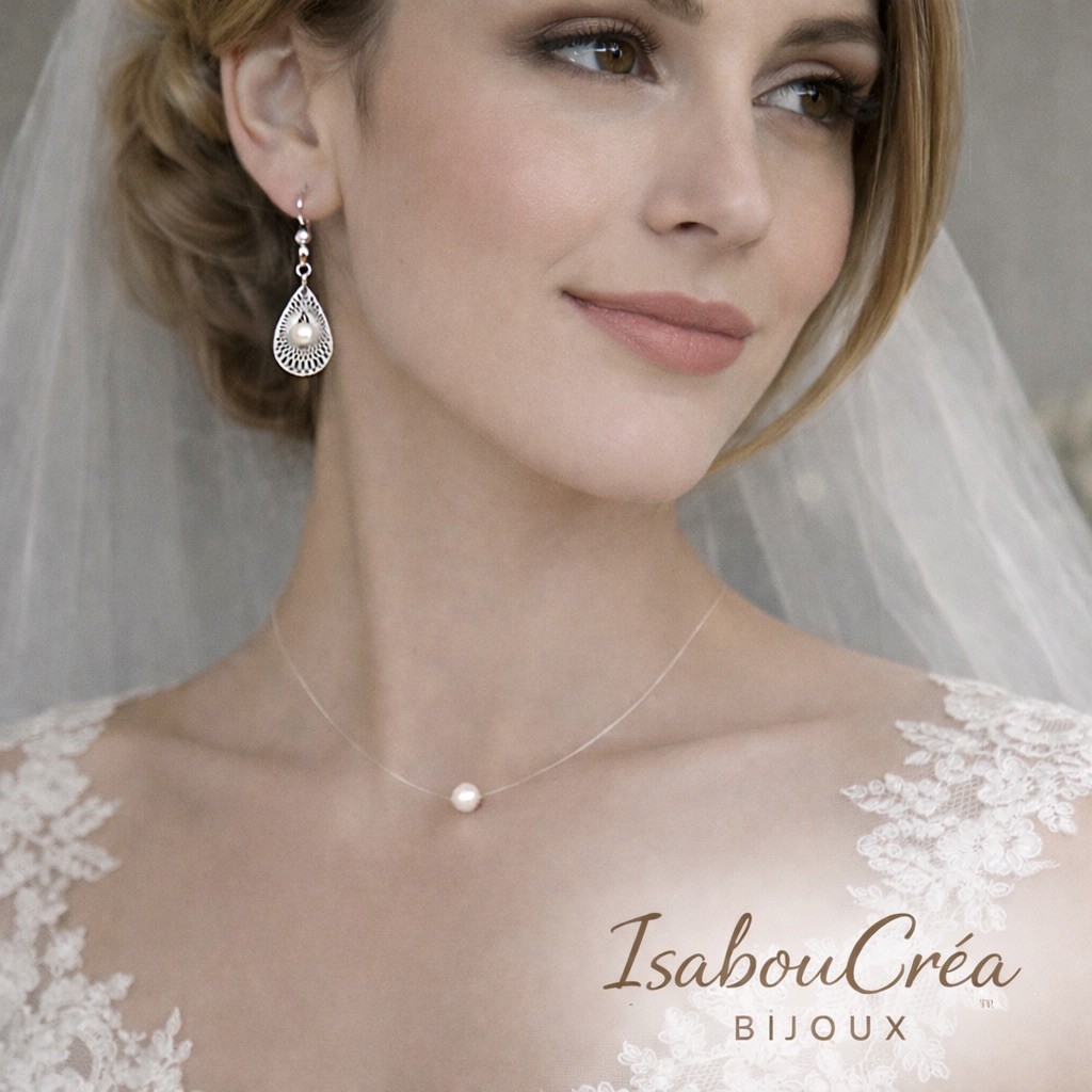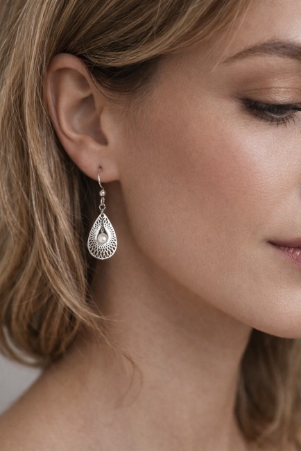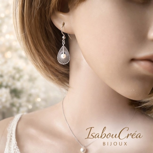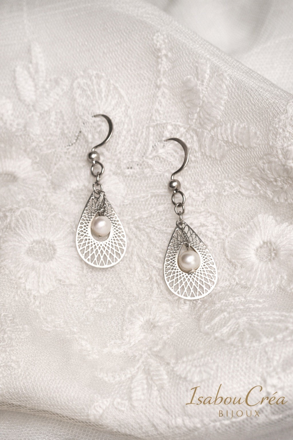 Boucles d'oreilles réalisées avec des crochets en acier inoxydable, des perles de culture d'eau douce et deux gouttes ajourées rhodiées de 10x12mm.