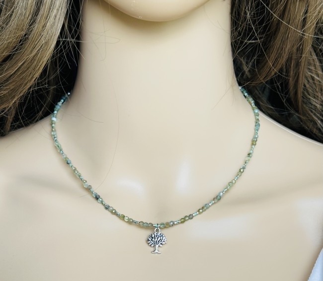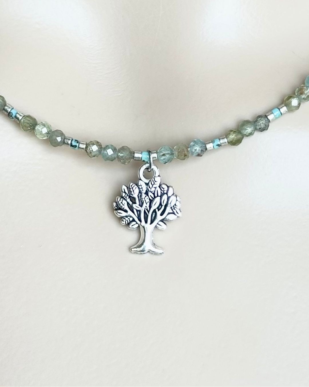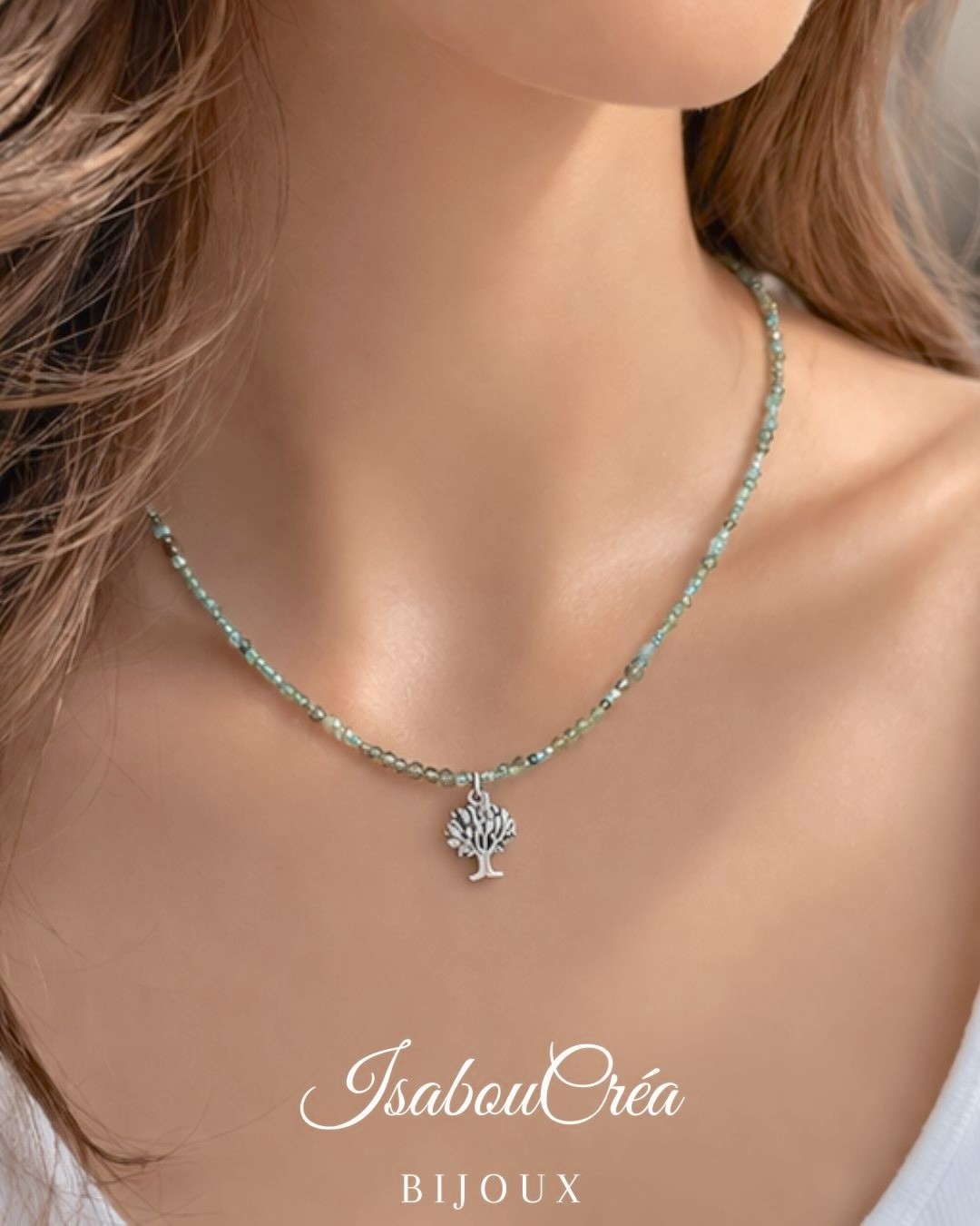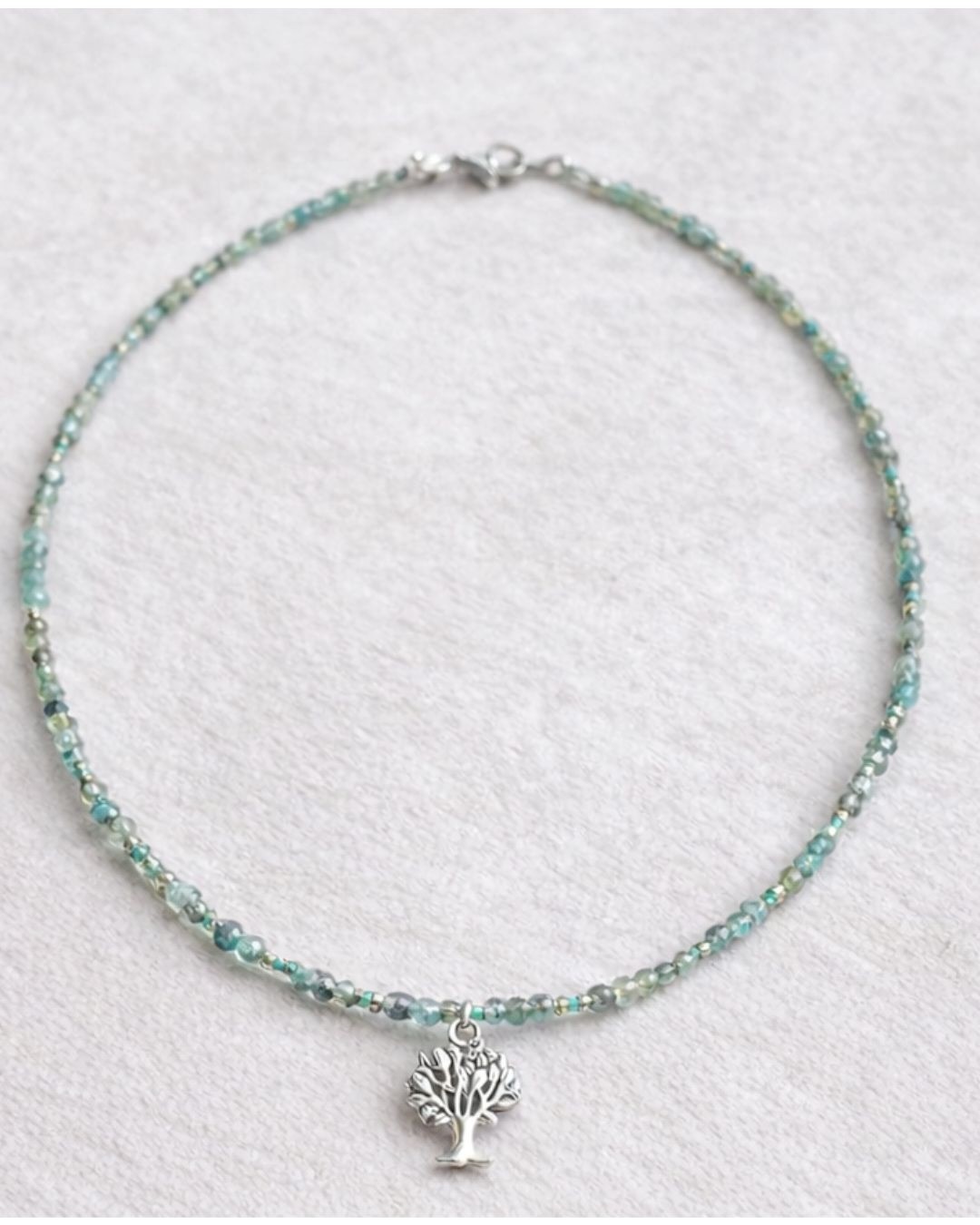 Ce collier fin est réalisé avec des petites perles naturelles en apatite vert océan de 3mm, des petites perles en argent, des petites rocailles turquoises, et un petit pendentif arbre de vie en métal argenté de 1,5cm de long.