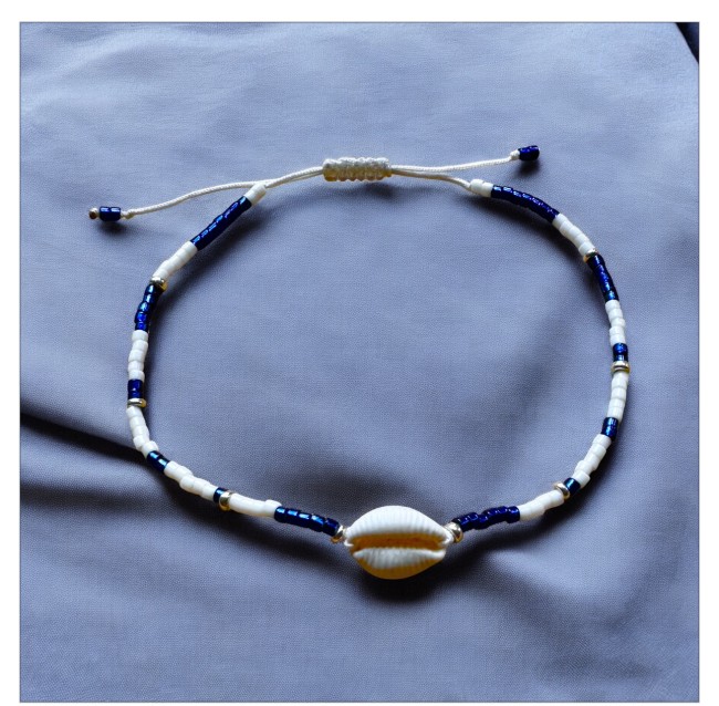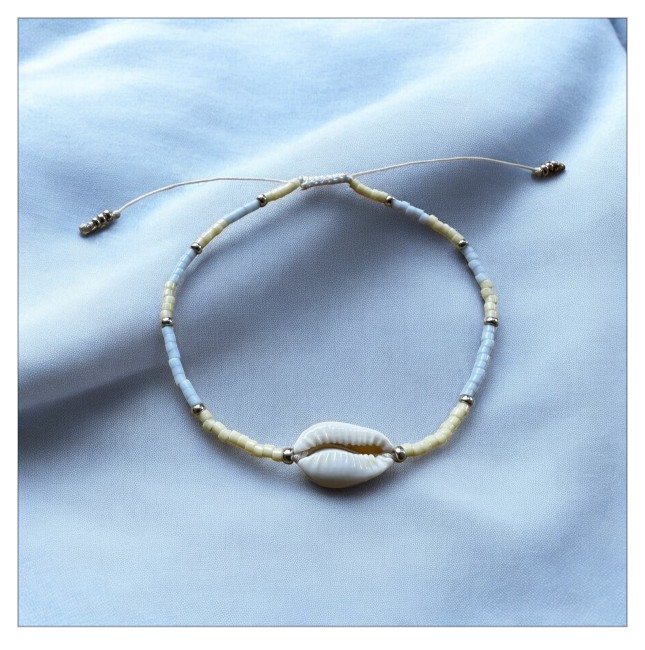 Bracelet très fin réglable avec coquillage grain de café et perles miyuki bleues et blanchesBijoux Avec Coquillage Et Pierres Naturelles