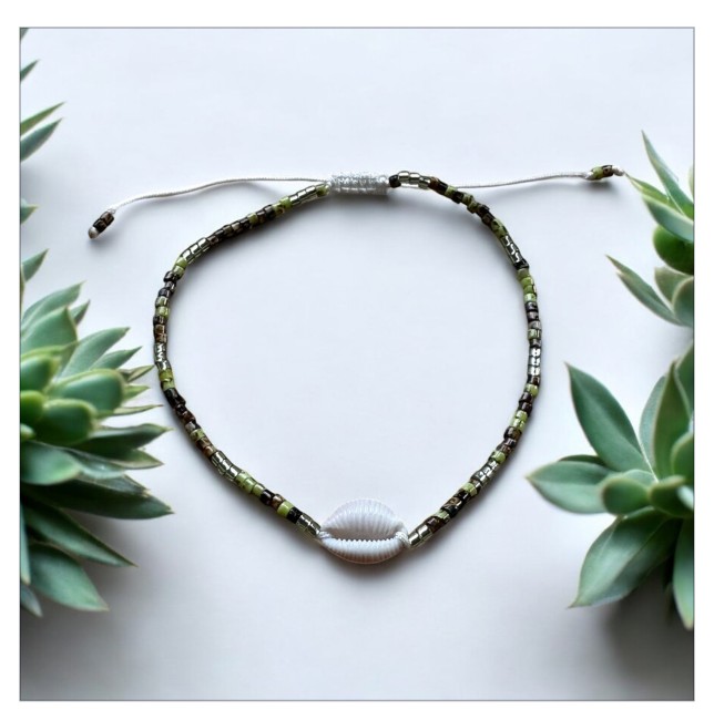 Bracelet très fin réglable avec coquillage grain de café et perles miyuki vertes kaki et marronsBijoux Avec Coquillage Et Pierres Naturelles