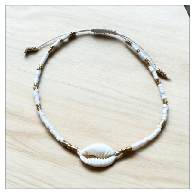 Bracelet très fin réglable avec coquillage cauris et perles miyuki blanches et doréesBijoux Avec Coquillage Et Pierres Naturelles