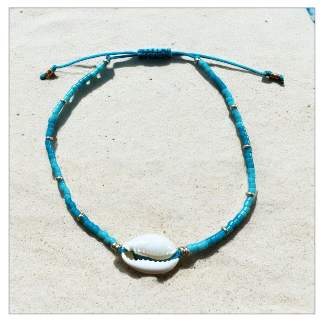 Bracelet très fin réglable avec coquillage cauris et perles miyuki bleues turquoisesBijoux Avec Coquillage Et Pierres Naturelles