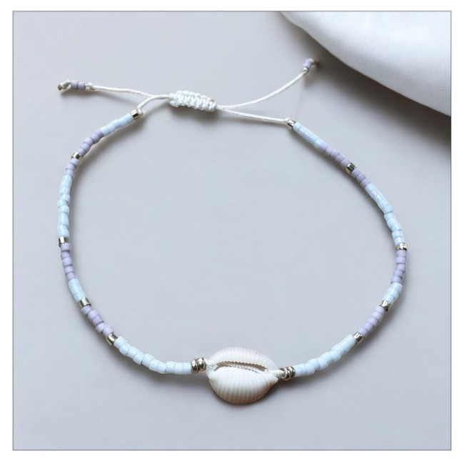Bracelet très fin réglable avec coquillage grain de café, perles miyuki mauves et bleues clairesBijoux Avec Coquillage Et Pierres Naturelles