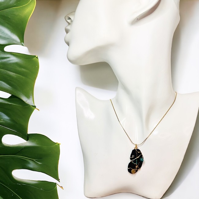 Collier doré avec pendentif en ardoise et chrysocolleColliers Avec Pierres Naturelles